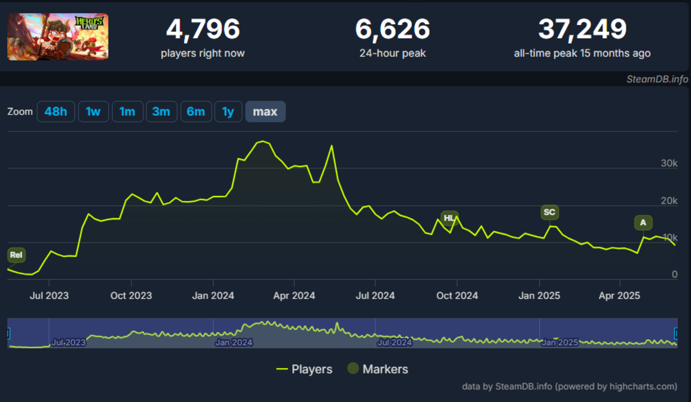 由点触科技旗下钢之男工作室研发的《英勇之地》是该梯队表现最出色的产品,该作最早名为《沙盒与副本:英勇之地》于2023年5月上线Steam平台,初期成绩一般,经过不断调整后,2024年2月其同时在线人数超过3.7万,然而同年6月在线人数开始快速下滑,此时团队决移植手游版本。
