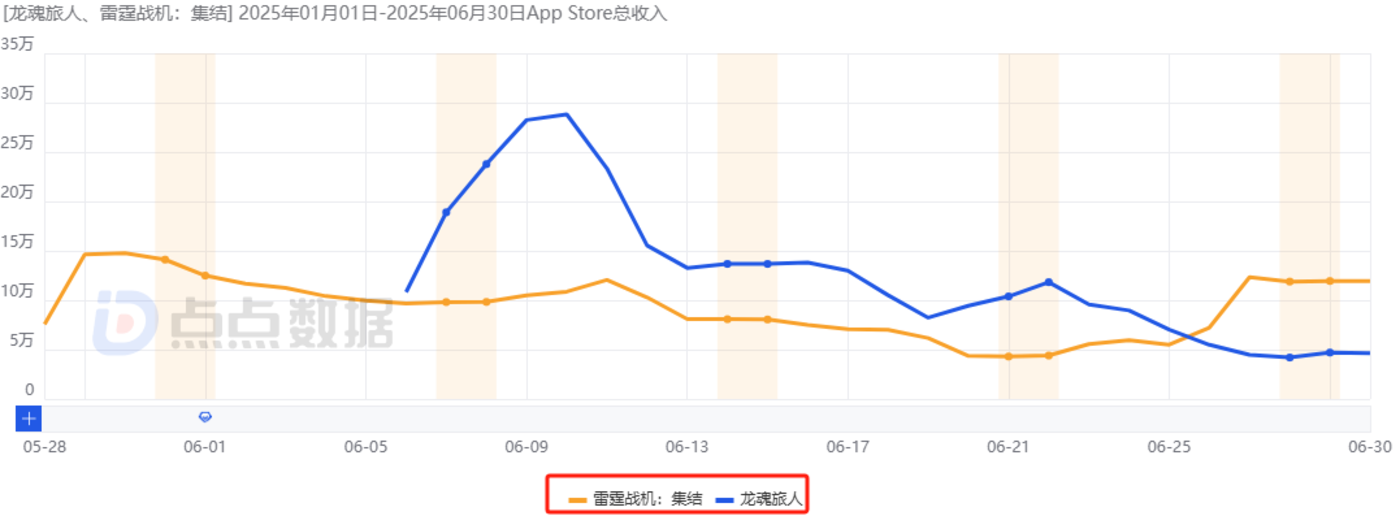 紫龙游戏旗下的《龙魂旅人》与爱乐游旗下IP延续之作《雷霆战机:集结》属于该梯队公测时间较晚的,前者属于先出海再回流的产品,国服iOS端首月流水为2412万,但就趋势而言其和港澳台服一样已经开始出现高开低走的问题了,长线需要观察;