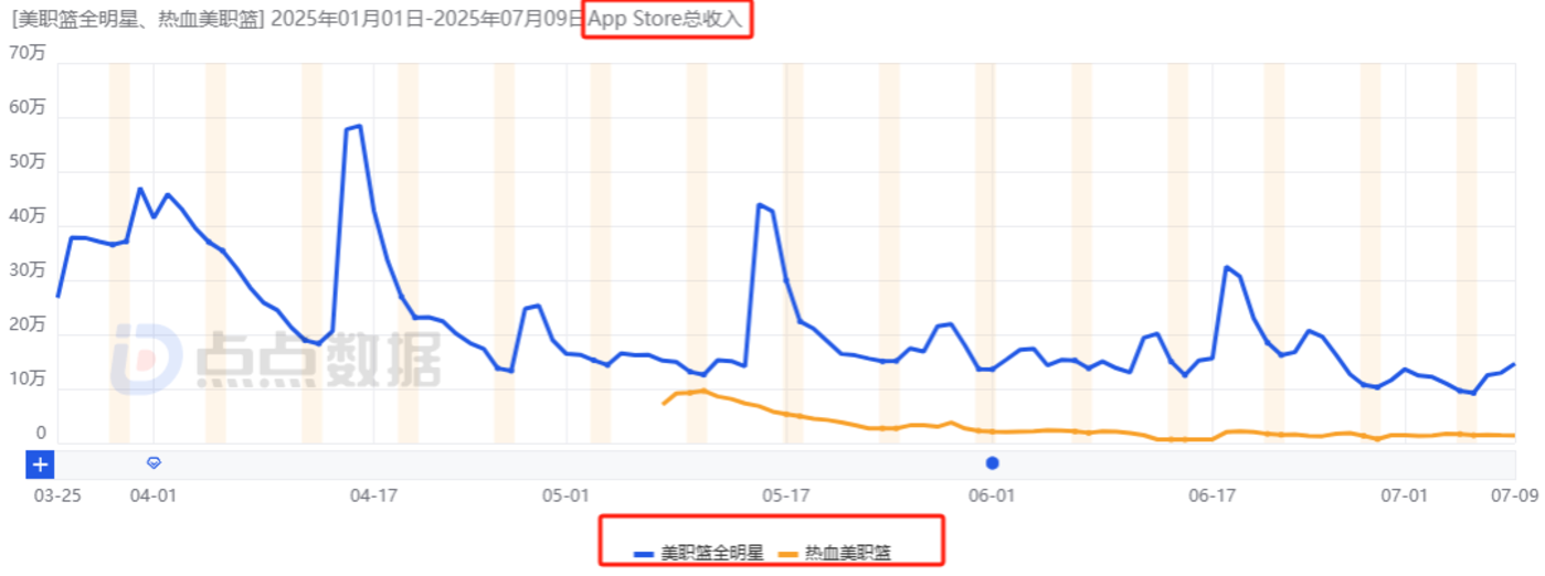 需要注意的是,作为用户较为垂直的竞技篮球赛道,除了《美职篮全明星》,腾讯还在今年5月8日推出了《热血美职篮》,但后者的市场表现明显乏力,当前月流水仅为350万,不到前者的十分之一。而参考网易《全明星街球派对》的发行节奏,预估《美职篮全明星》大概率会出海。
