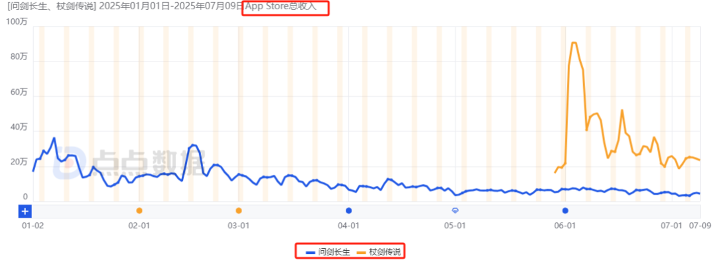 雷霆年初推出的《问剑长生》处于一梯队的第4名,为了便于分析,点点出海将该作与二梯队同公司旗下的《杖剑传说》放在一起分析。