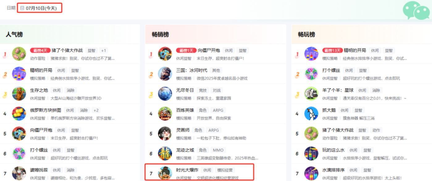 游戏在APP端推出后不到两个月就推出了小游戏端,并很快冲上畅销榜TOP5的位置,当前其依然位于微信小游戏畅销榜第7的位置。