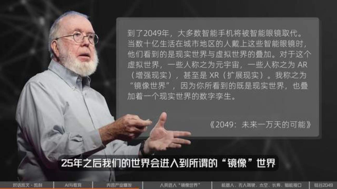 在书中,K.K.对未来的畅想的一个重要逻辑是,25年之后我们的世界会进入到所谓的“镜像”世界。他写到,“到了2049年,大多数智能手机将被智能眼镜取代。当数十亿生活在城市地区的人戴上这些智能眼镜时,他们看到的是现实世界与虚拟世界的叠加。对于这个虚拟世界,一些人称之为元宇宙,一些人称之为AR(增强现实),甚至是XR(扩展现实)。我称之为 “镜像世界”,因为你所看到的既是现实世界,也叠加着一个现实世界的数字孪生。”