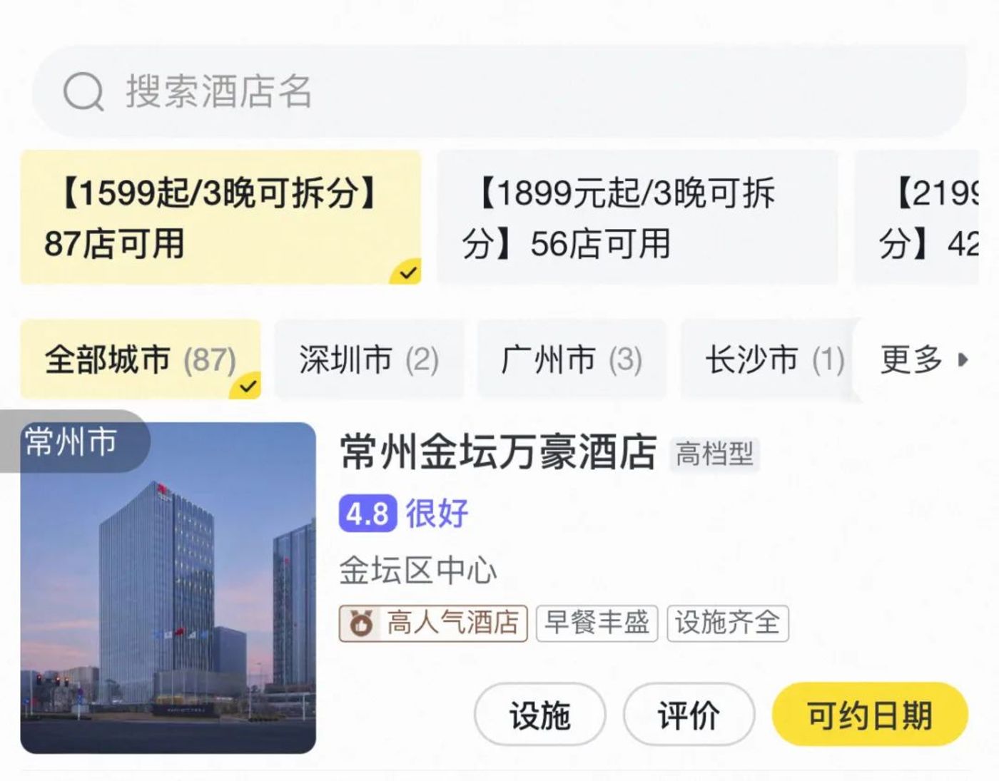 在高星级领域,酒店集团旗下的各种品牌出现,商家入驻的品牌效应开始显现,类似杭州JW万豪酒店、杭州钱江新城万豪酒店等万豪旗下的酒店品牌,都归属于万豪国际集团旗舰店中,进入旗舰店的直播间,发现更多酒店套餐选择。如万豪集团三晚加双份早餐,仅1599元,换算下来500元/晚左右,有常州金坛万豪酒店、杭州临安万豪酒店等酒店选择,不过套餐时间段限制在暑期。其他OTA平台上并没有套餐价,常州金坛万豪酒店在携程和美团上工作日的价格接近600元/晚,没有飞猪优惠。