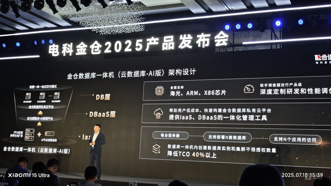其中,拥有AI功能的金仓数据库一体机首次亮相,其融合金仓数据库、超融合平台、高性能硬件及AI大模型,全面支持海光、ARM、X86芯片,帮助用户低成本、快速构建金仓数据库私有云平台,提供laaS、DBaaS的一体化管理工具,联手深信服进行产品级深度定制研发和性能调优,数据库一体机内创建数据库实例和集群不限授权数量,降低TCO(总拥有成本)40%以上。