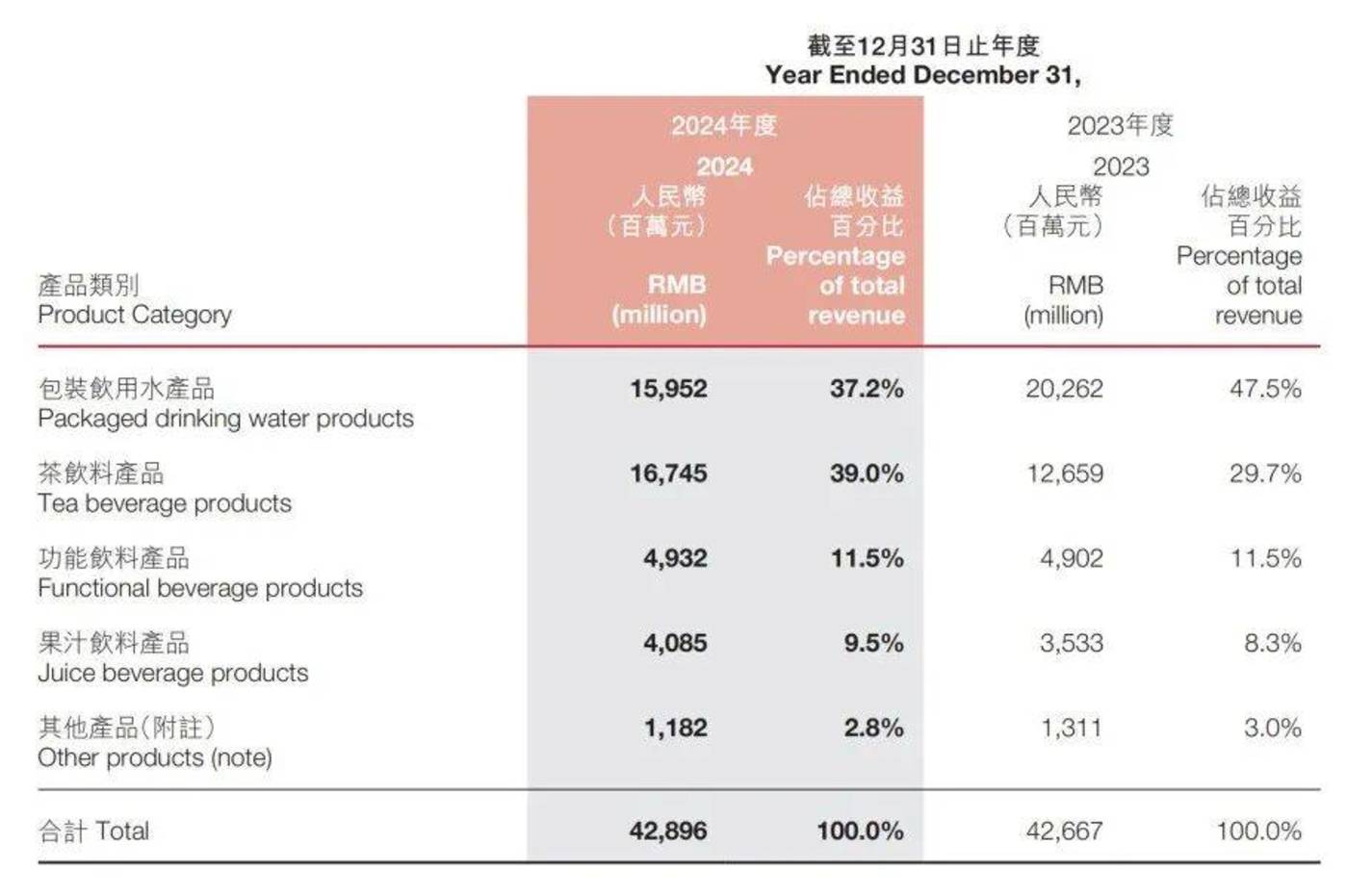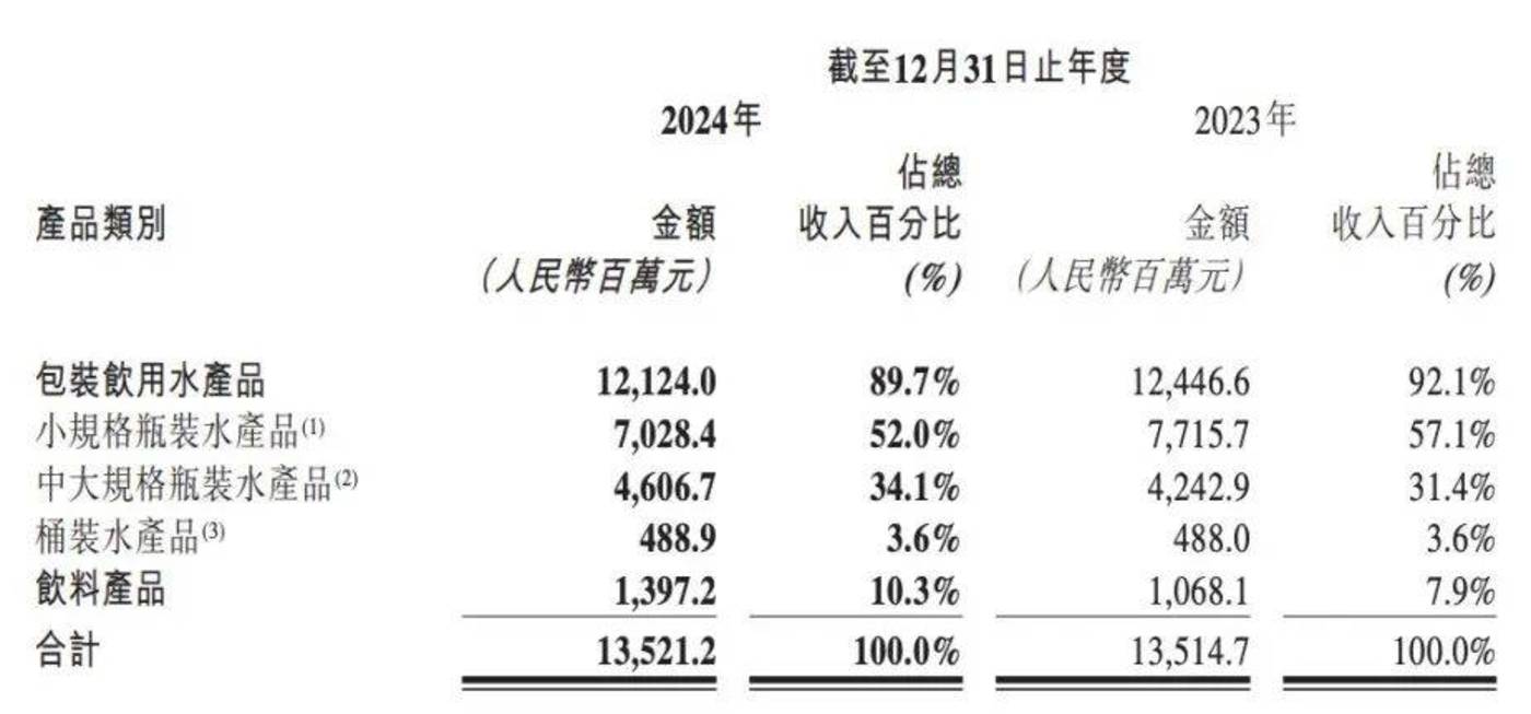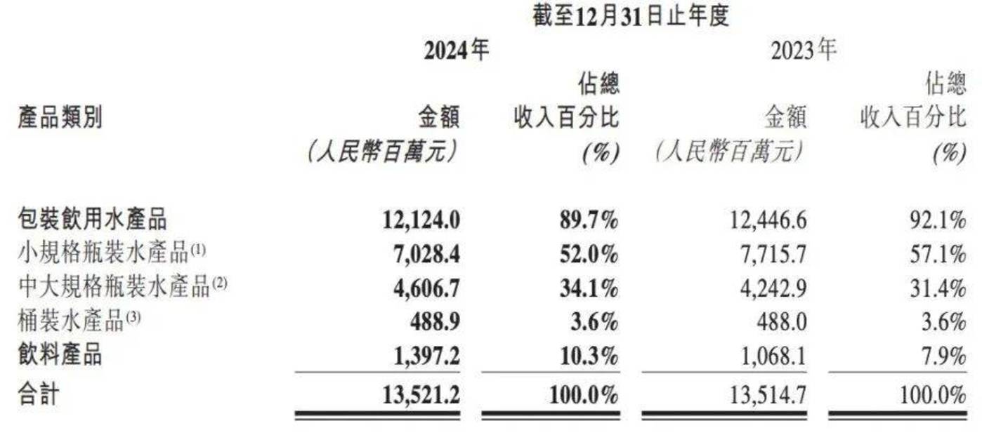 不过,华润饮料仍在水战中颇为受伤,2024年小规格瓶装水产品收入同比减少了6.88亿元,同比下滑8.9%。