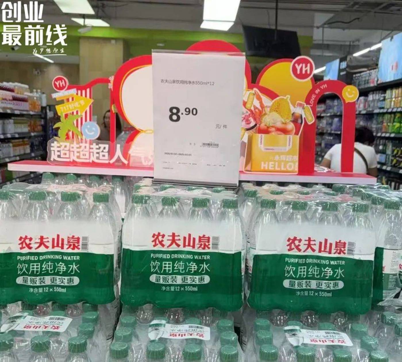线下的价格竞争同样激烈。「创业最前线」在北京一家永辉超市发现,农夫山泉12瓶绿瓶纯净水量贩装已经把价格打到了8.9元/件。
