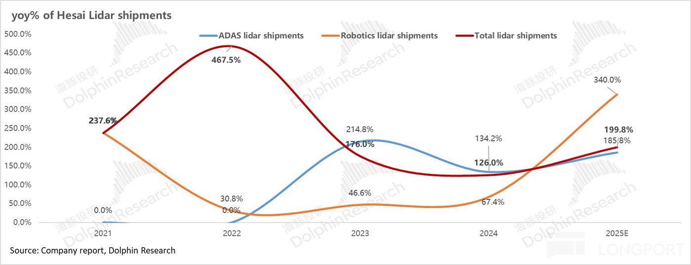 但禾赛对泛机器人领域 2025 年的出货量指引为 20 万台,出货量同比增速达到了 340%,有望成为禾赛继 ADAS 乘用车雷达后下一个增长点,带来更广阔的对机器人赛道的应用场景想象空间。