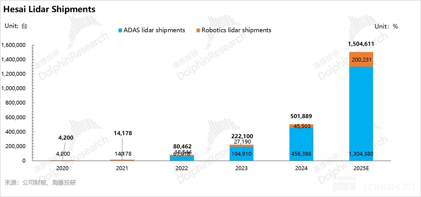 在 2025 年,禾赛指引总激光雷达出货量为 120-150 万台,而其中 100-130 万颗是 ADAS 激光雷达的出货。