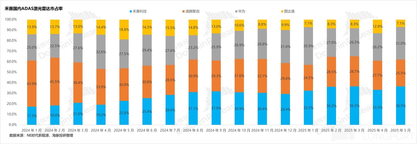 在从 2024 年 1 月,速腾的激光雷达出货量市占率还处于反超禾赛的状态,但后续禾赛在国内 ADAS 激光雷达的市占率不断提升,在 2024 年 7 月开始就实现了对速腾的反超,而在 2025 年一季度 ATX 出货之后,禾赛从出货量来看,也成功登顶国内 ADAS 激光雷达的龙一地位。