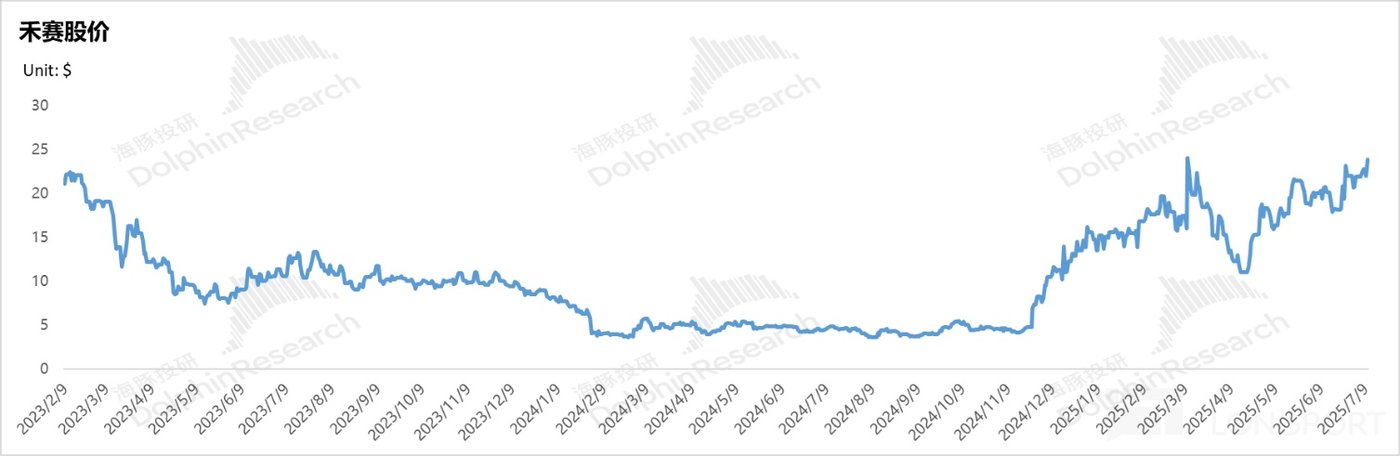 而截至 2025 年 7 月 14 日收盘, 禾赛的股价涨幅相比去年三季报前的上一轮估值大涨启动点已经翻了有 4 倍!