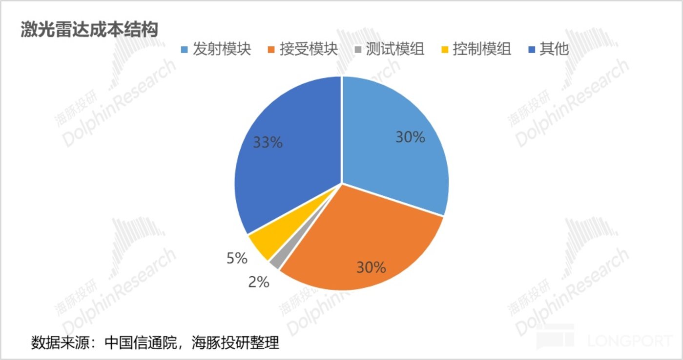 在激光雷达的成本结构中,根据中国信通院数据,光电系统占激光雷达整机成本约 70%,由激光发射模组、激光接收模组、测时模组(TDC/ADC)、控制模组四部分构成,其中激光收发模组成本占比更高,占激光雷达整机成本约 60%,是激光雷达最核心的部件。
