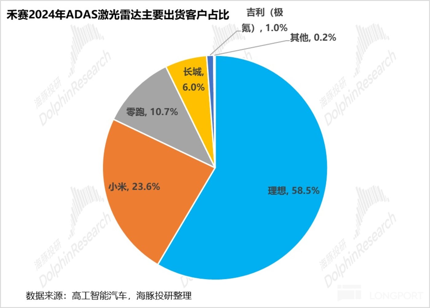 而从 2024 年禾赛 ADAS 雷达的下游客户来看,其中前三大出货客户以理想,小米,零跑为主,出货量占 ADAS 出货量比例达到 93%,禾赛乘用车赛道通过绑定大客户实现了出货量的快速增长。