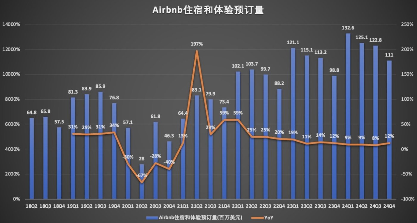 总预订金额(GBV)是Airbnb最核心经营指标之一。2024年四季度GBV同比增长13%,达到176亿美元,是2024年增速最快的一个速度。