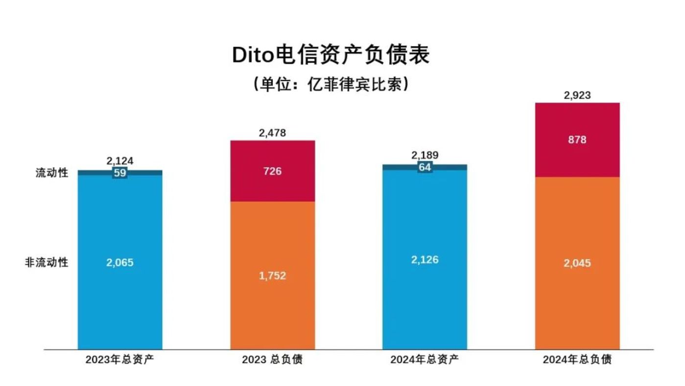 然而,DITO电信2024年的总负债同比增长了18%,高达2923亿比索(约51亿美元),但总资产仅同比增长3%达到2189亿比索(约38亿美元),资不抵债的状况进一步恶化,且缺口在一年内扩大了一倍。更为严峻的是,DITO电信的流动负债(878亿比索)在2024年激增了21%,而流动资产(63.7亿比索)仅微增7%,短期偿债能力进一步承压,如无法及时补充资本金或续贷,DITO电信的持续经营能力将受到严峻考验。
