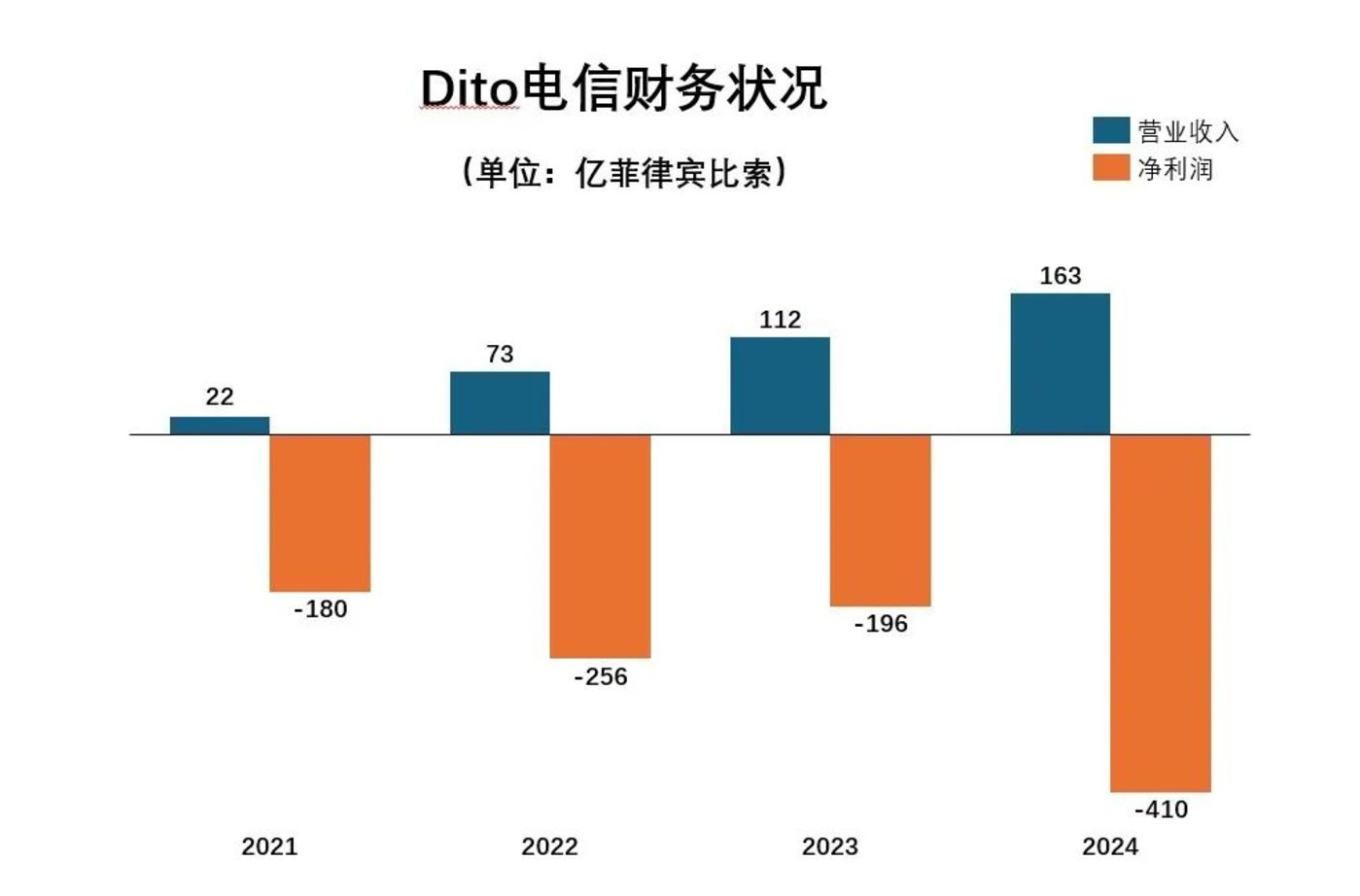 如今的DITO电信正面临严峻的生存挑战。根据其母公司DITO CME 2024年的财报数据,自2021年开始运营,来自DITO电信的累计亏损已经高达1042亿菲律宾比索(约18亿美元)。