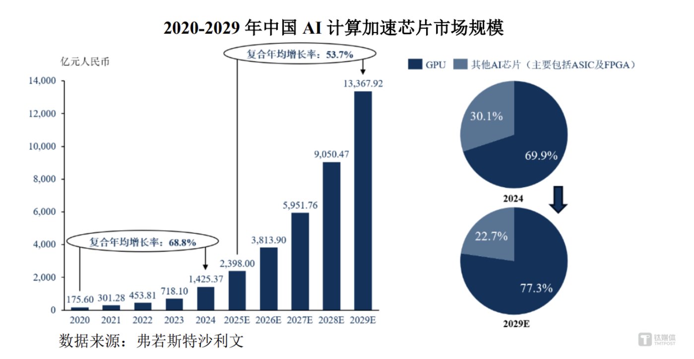 据弗若斯特沙利文统计,2024年,中国AI计算加速芯片市场规模1425.37亿元,到2029年激增至13367.92亿元,期间年均复合增长率53.7%。同时,2024年中国算力总整体规模达617.00EFLOPs,预计到2029年达3442.89EFLOPs,年均复合增长率40%,其中,智能算力2025年-2029年期间年均复合增长率高达45.3%。