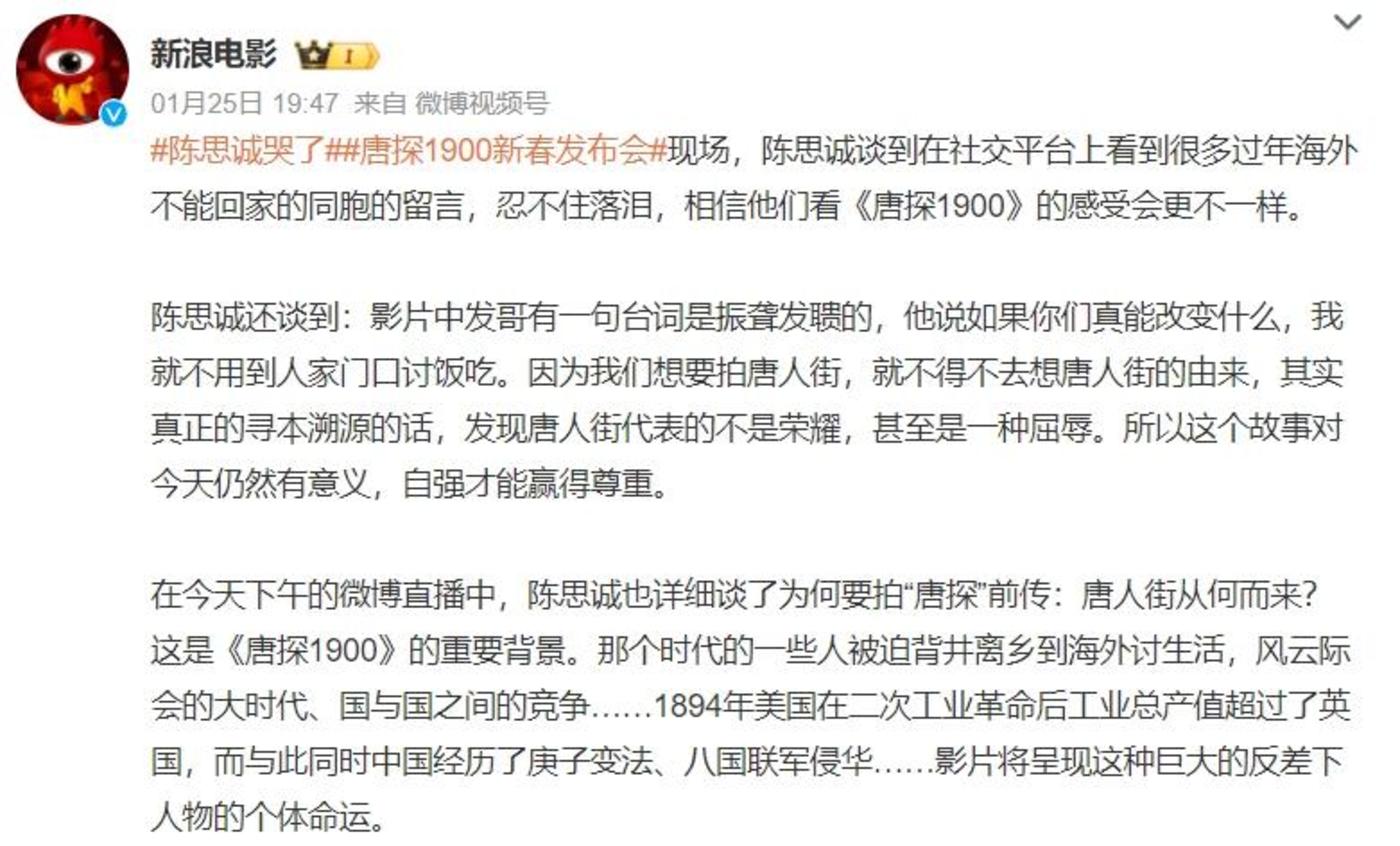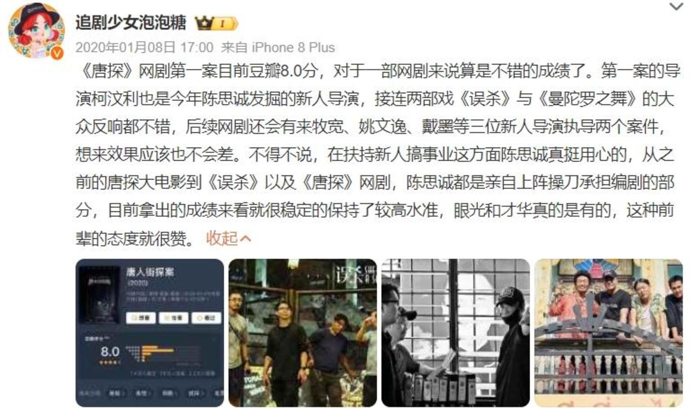 近年来,陈思诚还扶持了很多新人导演,如《误杀》导演柯汶利、《唐探1900》导演戴墨,试图培养出对类型片、商业电影具备有热情的青年电影人梯队。