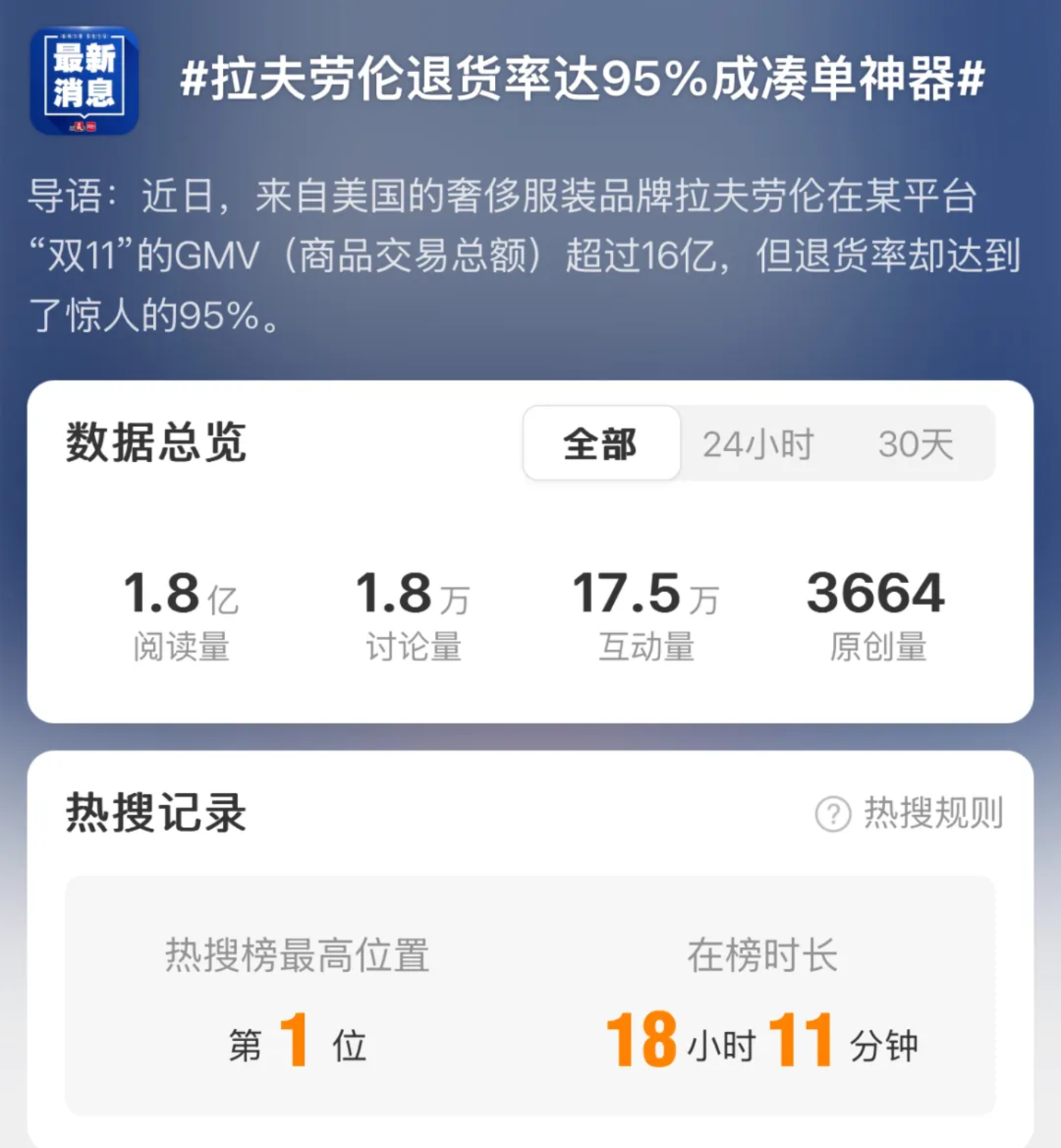 先是在去年双11被当成“凑单冤种”。据新华报业网,网友在一买一退之间,活生生给拉夫劳伦凑出了16亿元交易额和95%的退货率,还顶着“双11最惨”名号在热搜上被挂了将近一天。
