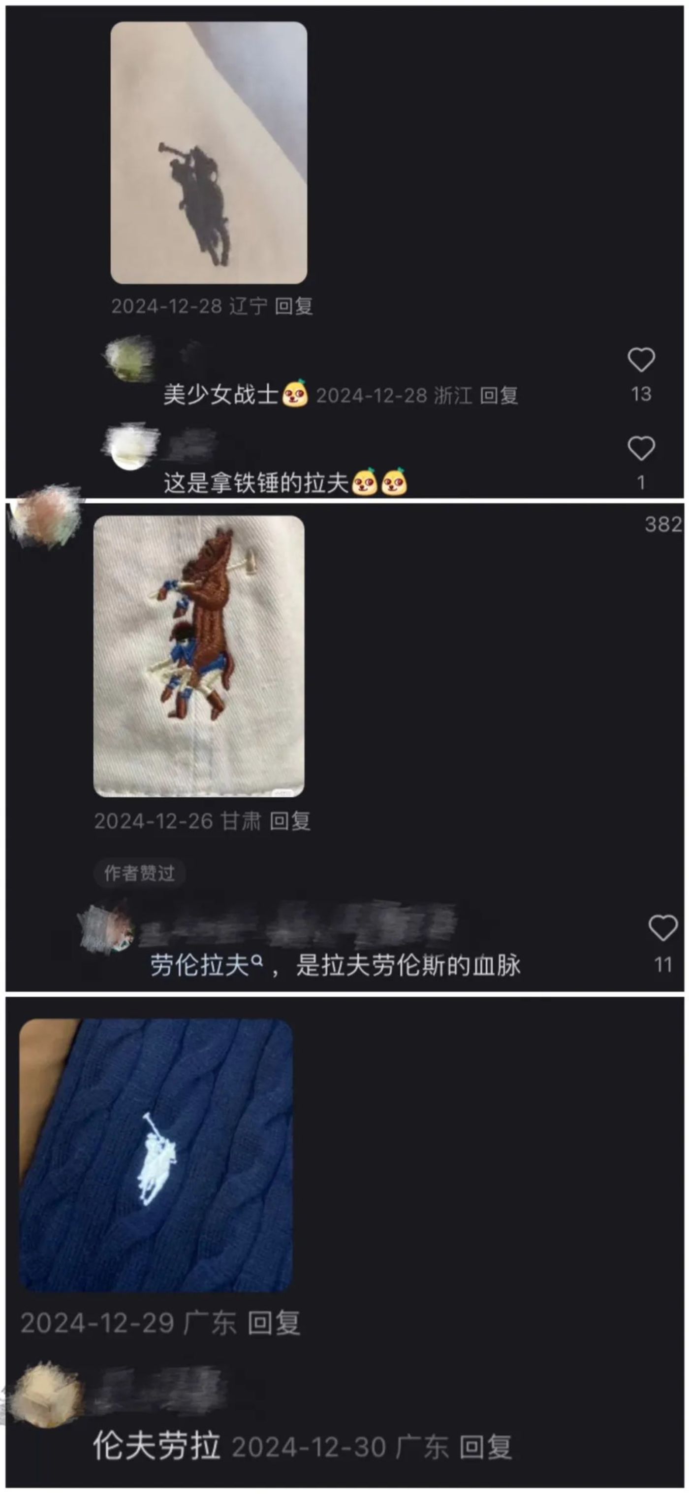 评论区里,有人表示“不问百度还真想不起来”,还有更多人将自己的“拉夫劳伦”发上来,询问是否正品。这些图片里的logo,有骑骡子的、有抗铁锤的、有反向骑马的,还有马骑人的。
