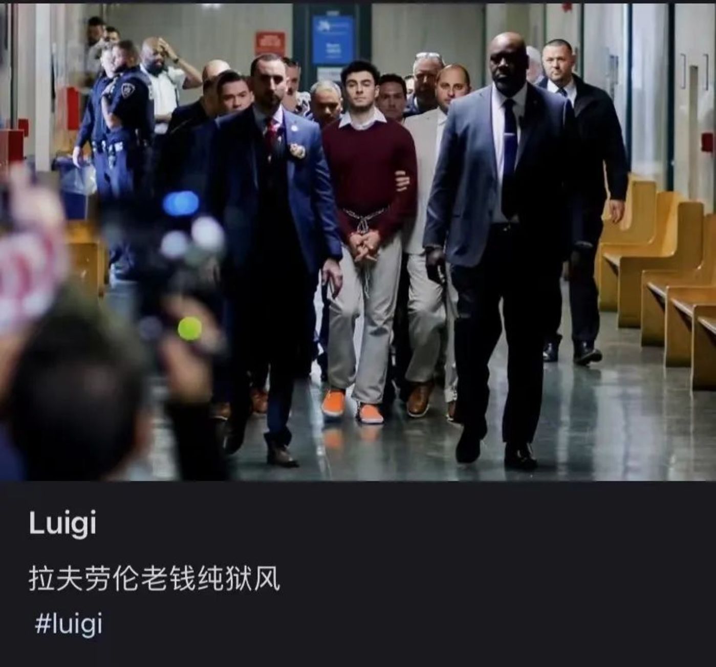 接着在去年12月末,与特朗普争夺年度最佳镜头奖的路易吉,身穿枣红色毛衣在纽约最高法院走出了秀场感。由于毛衣的设计、路易吉的气场都与拉夫劳伦的老钱风近似,那组“杀疯了”的照片又被调侃为《“拉夫劳伦”老钱纯狱风》。