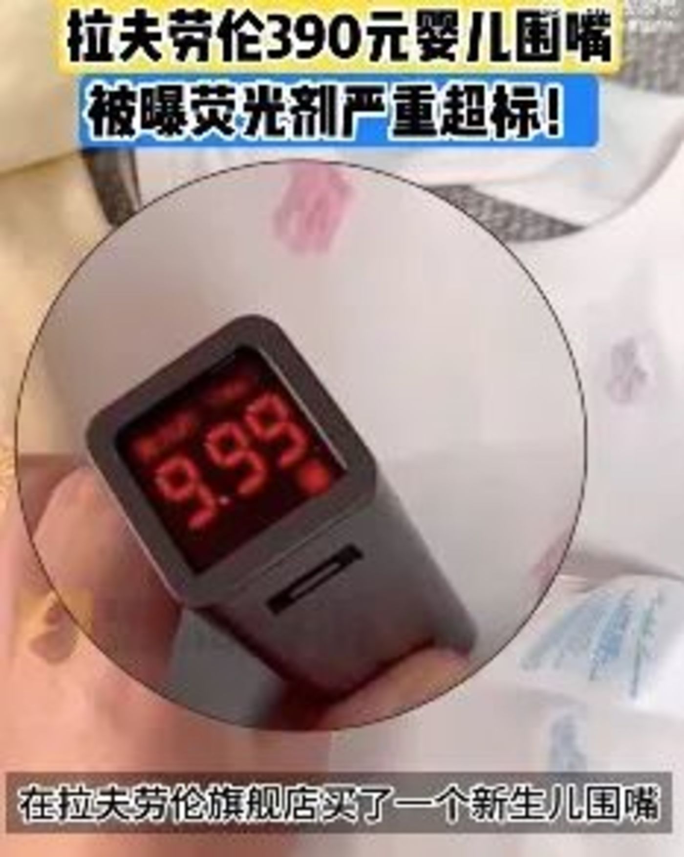 据新浪财经栏目《5D调查》报道,消费者李女士检测出,拉夫劳伦一款婴儿围嘴的荧光剂含量严重超标。此产品原价390元,荧光剂含量9.99,是机器能显示的数值上限。作为对比,李女士用同一支检测笔测了家里其他白色衣物,荧光剂含量都趋近0。