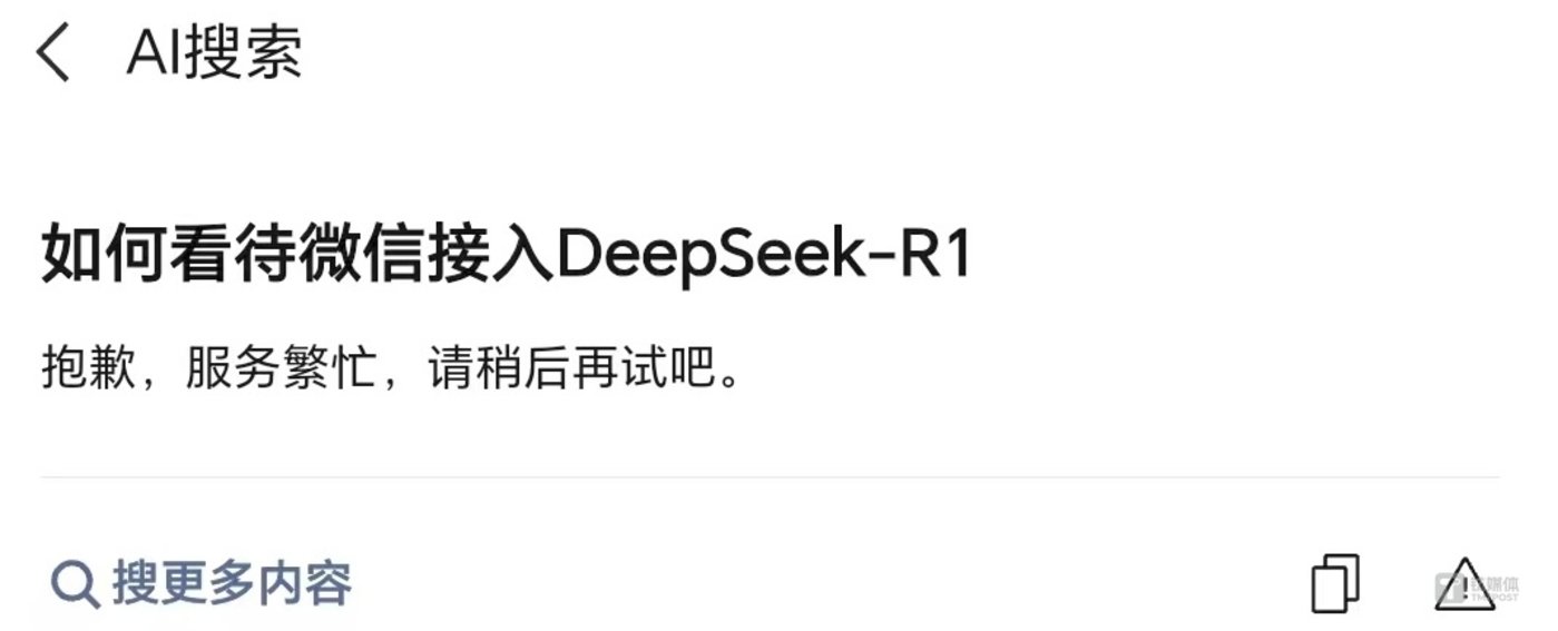 不过,上线不到一天时间微信开始“满负荷”。2月16日晚上23点左右,钛媒体AGI了解到,用户使用微信“AI搜索”,最终界面开始显示“抱歉,服务繁忙,请稍后再试吧”。