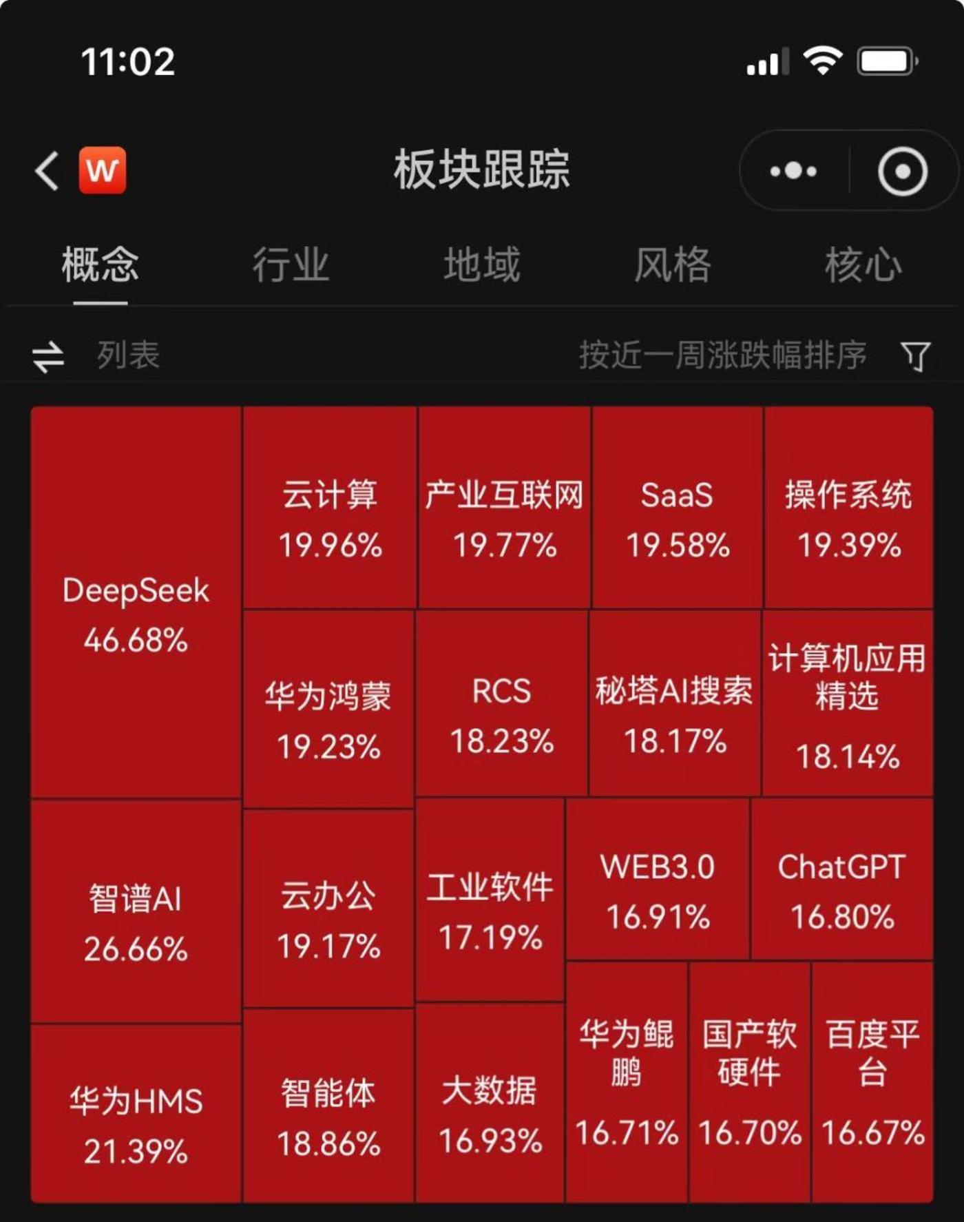 春节之后,A股中的“DeepSeek概念股”涨幅超过46%,同时带动了云计算、操作系统、华为鸿蒙等多个概念板块股价的上涨。