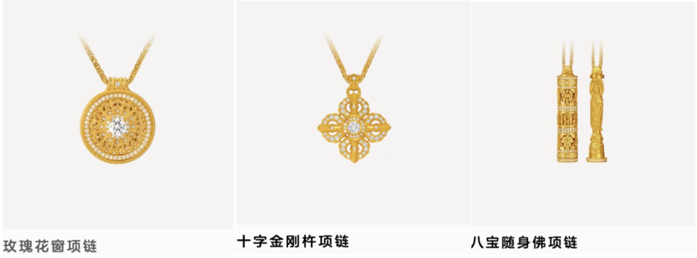 老铺黄金的产品,有40%左右单价集中于1万元-25万元,瑰花窗、十字金刚杵、随身佛等饰品以经典设计和精湛工艺深受欢迎。