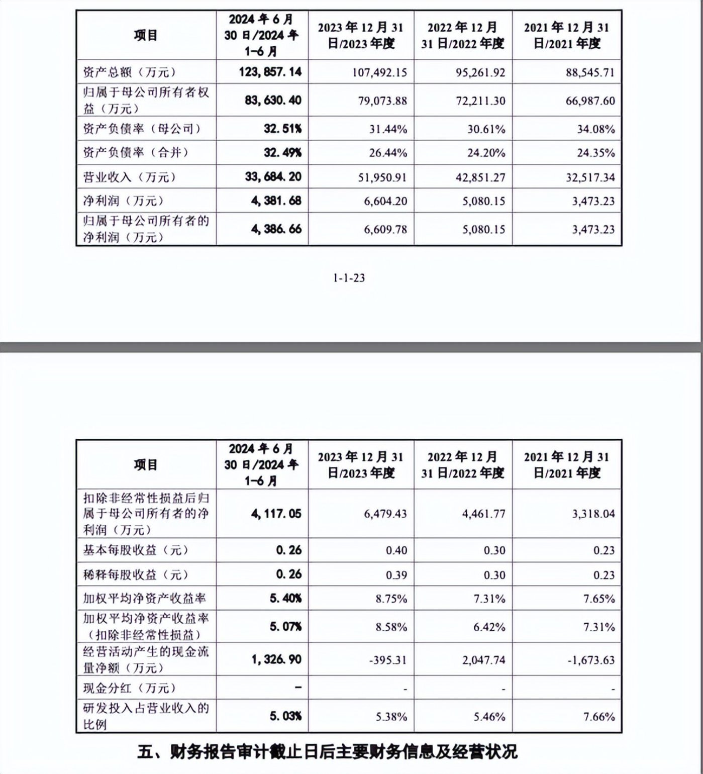 综合多份招股书,2019-2023年及2024年上半年,锦艺新材的营业收入分别约为1.44亿、2.12亿、3.25亿、4.29亿、5.20亿、3.37亿元;净利润分别约为-212.69万、485.77万、3473.23万、5080.15万、6604.20万、4381.68万元;扣非归母净利润分别约为-126.44万、436.63万、3318.04万、4461.77万、6479.43万、4117.05万元。