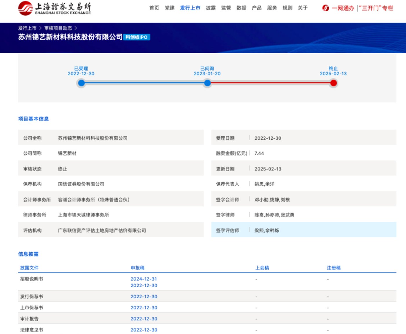 冲刺两年多,苏州锦艺新材料科技股份有限公司及其保荐人,于2月13日主动撤回发行上市申请,上交所宣布终止其发行上市审核。