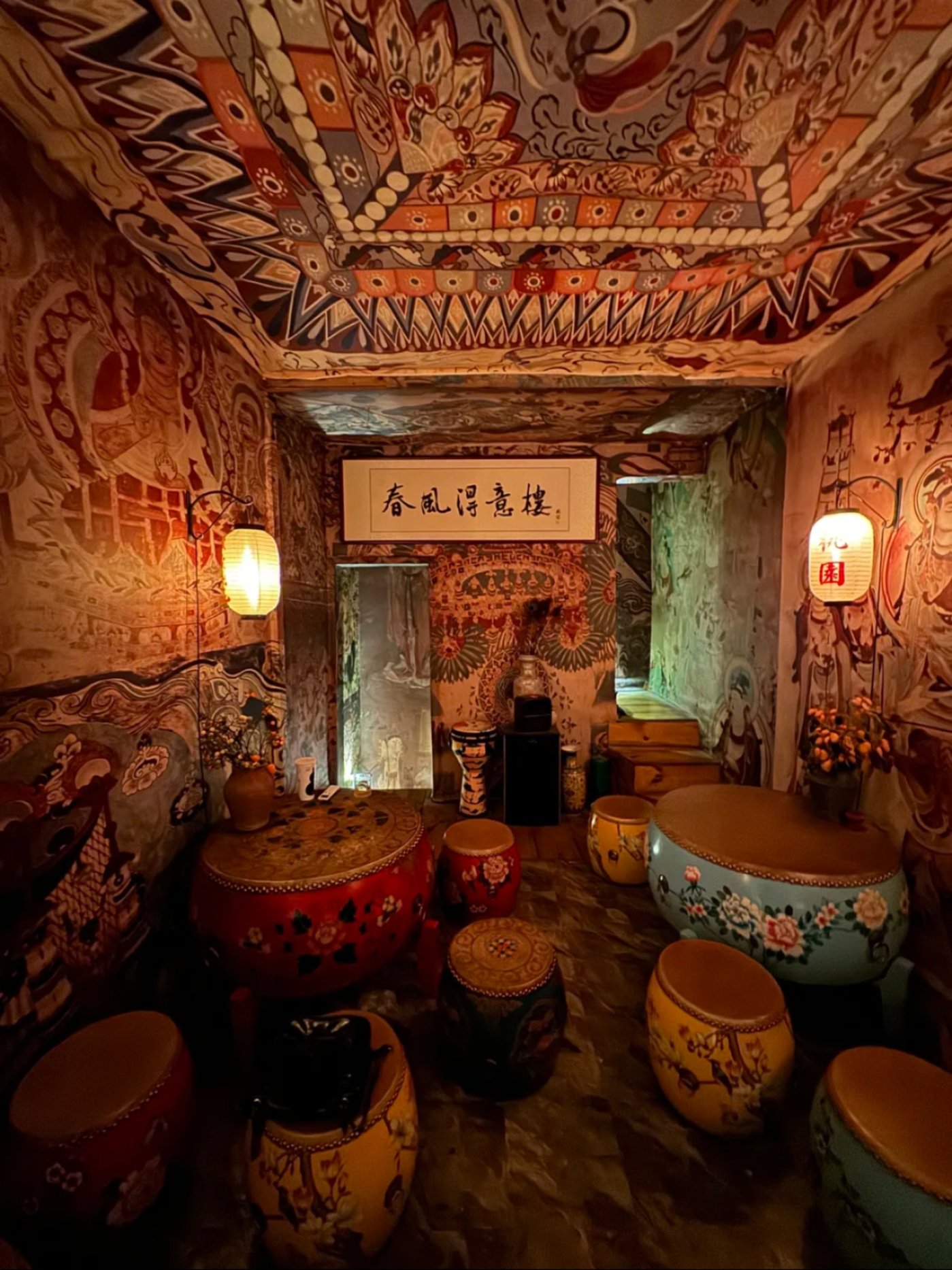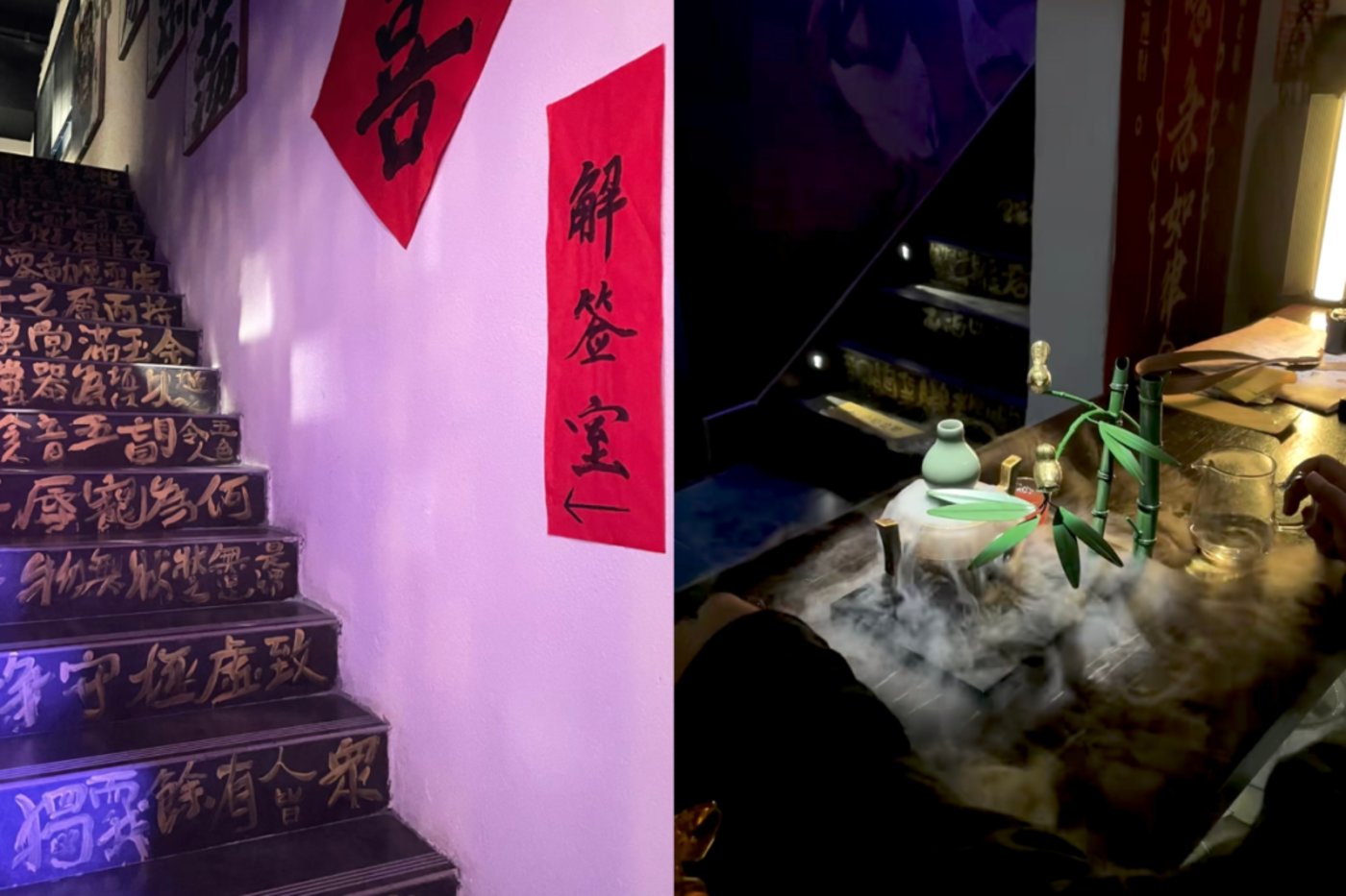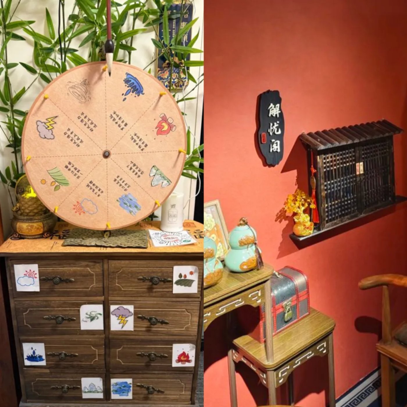 “做纯中式或碰撞风的软装,主打一个高辨识度低成本。八卦图等太极元素、符纸许愿墙、道教经典经文书法、财神像月老像和道士卦台这些是标配。有条件再加上流水摆台、古琴屏风增加沉浸感。”马大伟向剁椒Spicy透露“装修细则”。