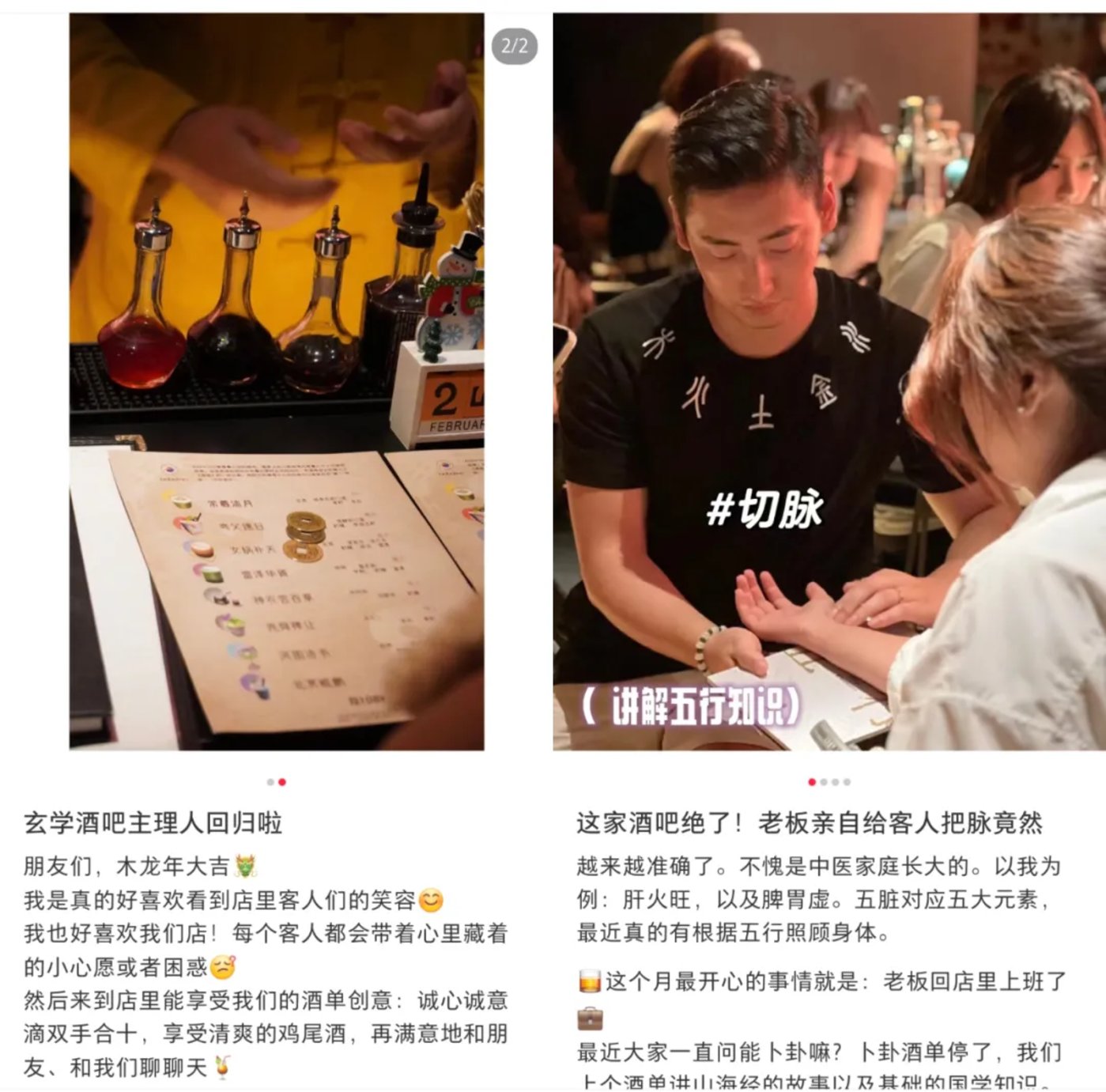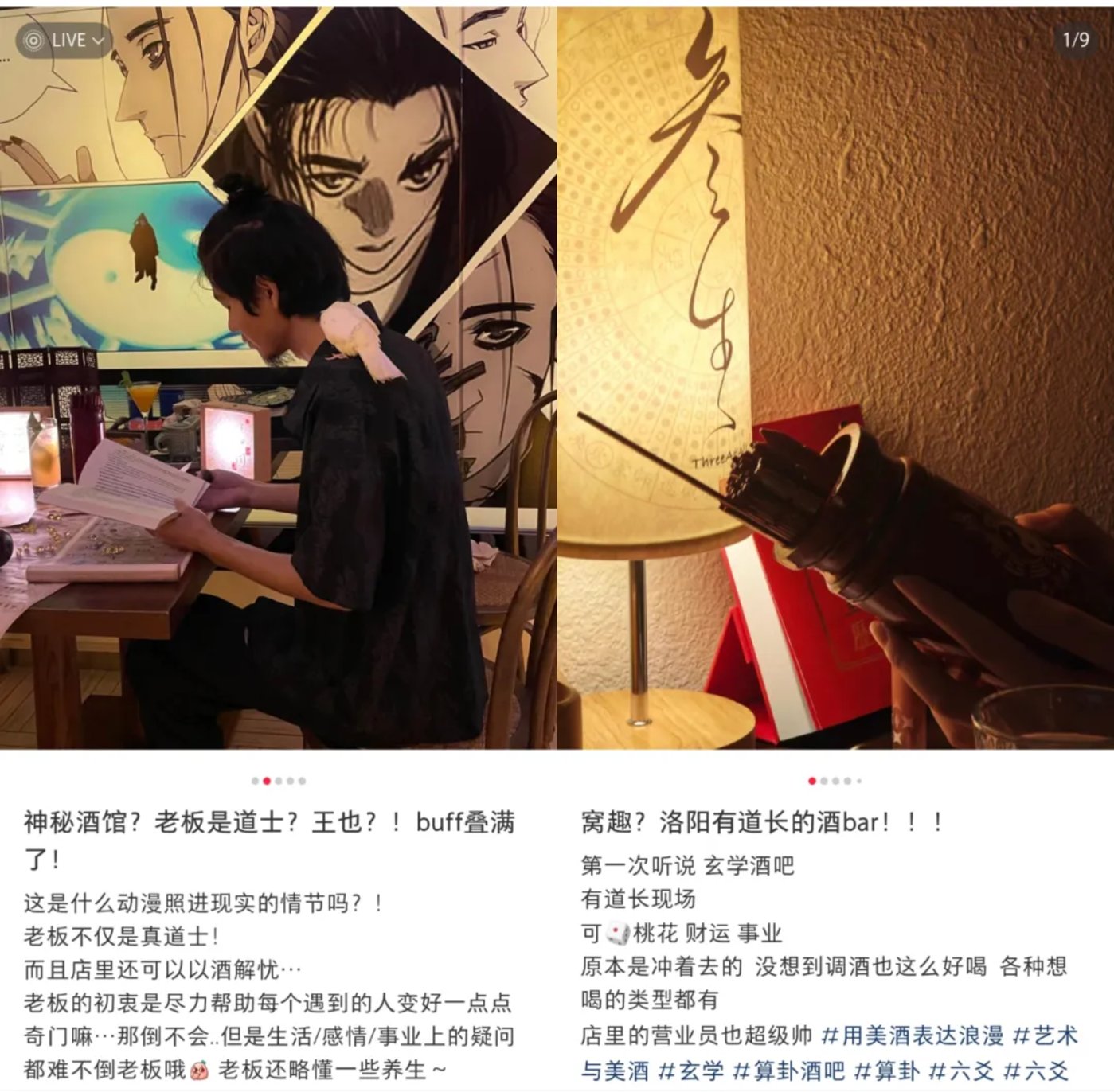 上海、北京的这两家店都有更高调的画风和更趣味化的呈现:主打玄学主理人概念,老板和店铺在小红书都颇为活跃,运营方式高度年轻化且强调玄学元素。也正因此,不止火在本地,还有大量探店博主到店内打卡,也直接带动了整个玄学酒吧在全国的大热。其中,一生万物、叁生万物的道教概念,更是直接成为全国各地酒馆的“参考对象”。