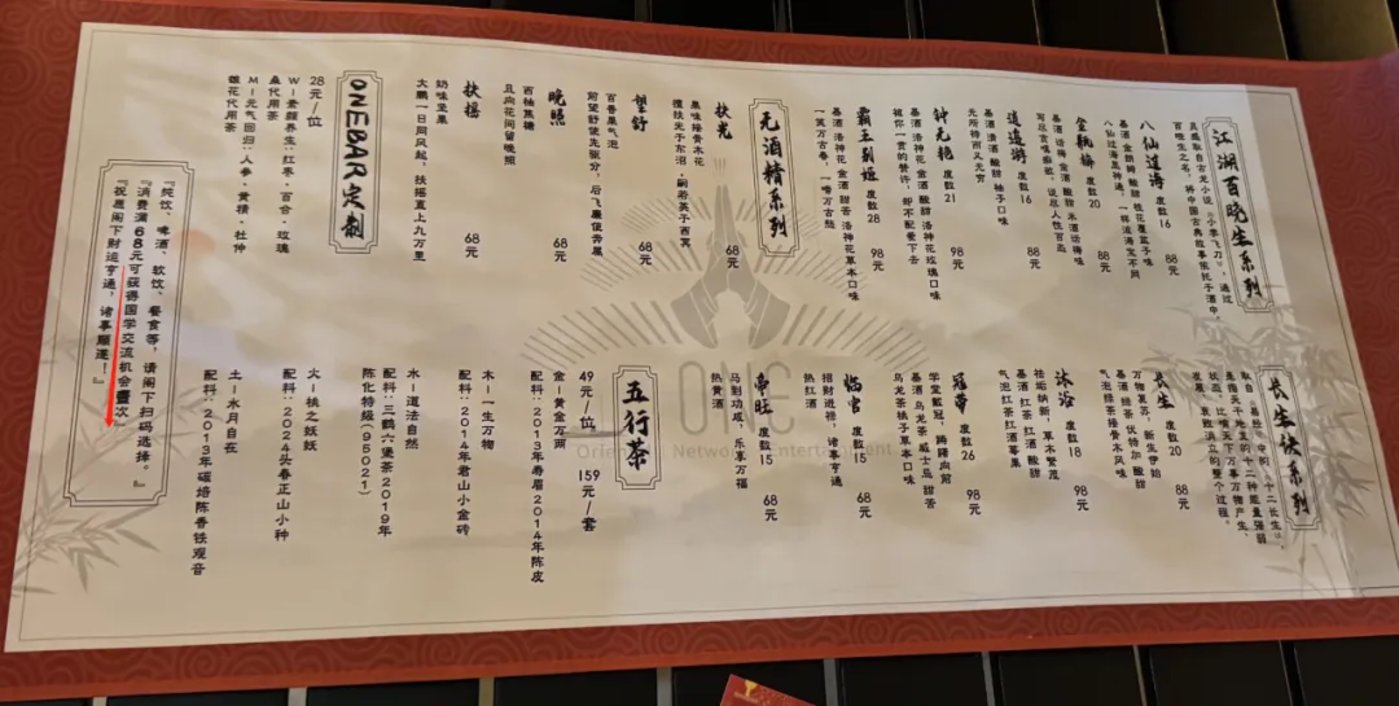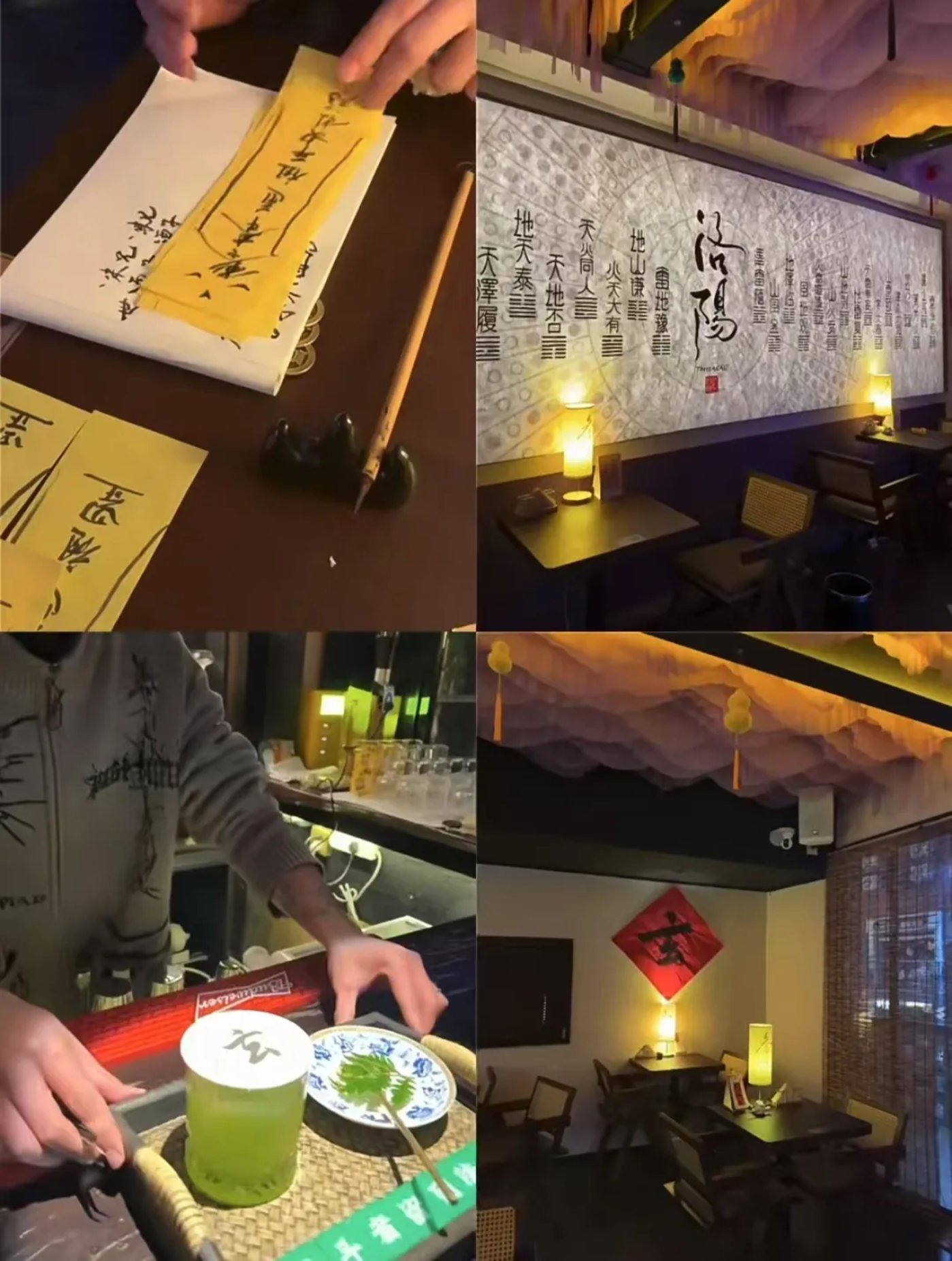 去年起,“玄学酒吧”的概念在社媒大火。点一杯酒,问问新一年的事业、财富、爱情,成为大量消费者进店的理由。古风卷轴造型的酒单,特调的五行酒、江湖酒和充满玄学风格的店内元素,都成为小红书的热门传播素材。