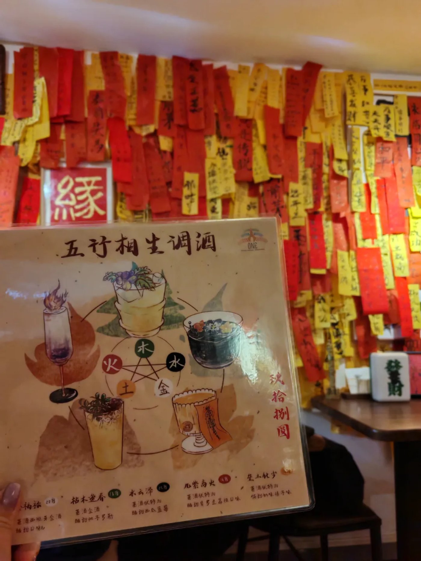 除了卦象和地理位置不同,两家店的装潢风格高度接近:袅袅升起的干冰云雾,耳畔萦绕的古琴演奏,贴着黄纸符文的五行酒套餐,还有一整面显眼的红色符墙……