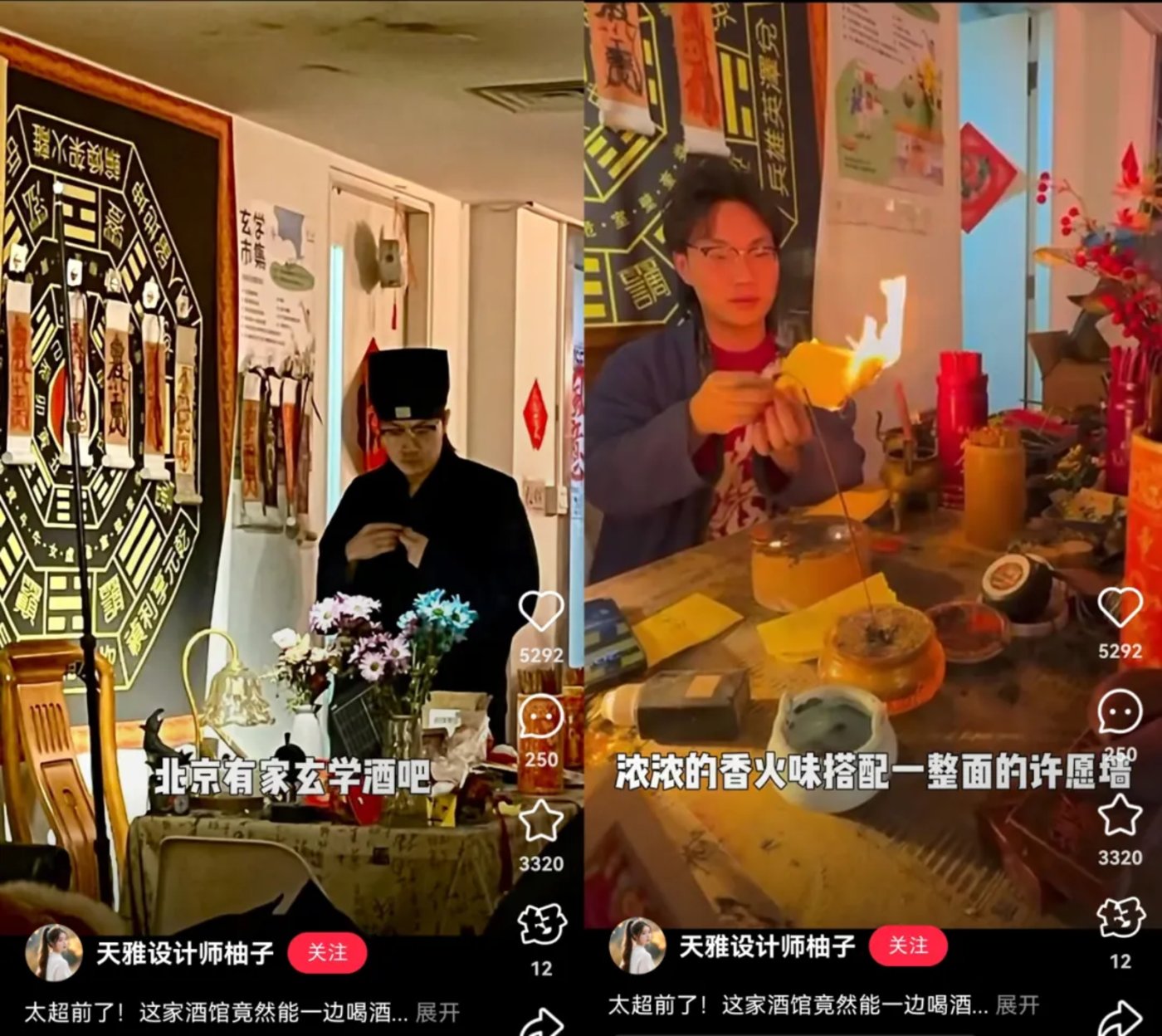 2023年末,北京万达广场写字楼开出本地首家玄学酒吧,关公像和桃花符,每桌备有的“摇签筒”,中庭燃着香火解签的道士台,对应五行的特调酒单……这家店带有更显著的道教因素,也迅速在小红书上大热。
