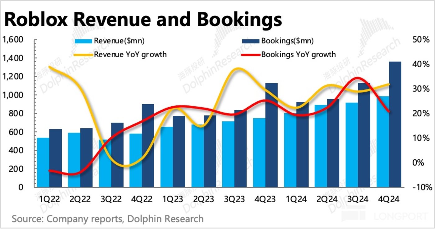 关于 Q1 以及 2025 年的利润目标,管理层仍然维持同比提升 100~300 基点的改善节奏,但电话会中透露并未将降本的考虑包含其中。因此这里的改善空间有望超出指引,除了费用端继续严控外(但人员成本会有个位数增速的增长),还会出现成本端的优化——今年年初,Roblox 开始引导用户通过官网 web 进行充值,并给予更多的 Robux 币激励,从而绕开移动端的 “苹果税”、“谷歌税”。