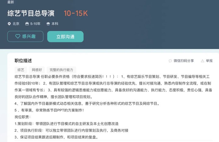 在李轩看来,出身于电视台的黄金一代与他们这代综艺人之间,能力和名气都彻底断代。打开boss直聘,正在招人的综艺公司空缺的大多是5年经验以上的制片人、总导演。与她一样的年轻导演们,都夹在够不上“总导演”,又不愿意做实习生的尴尬之中。