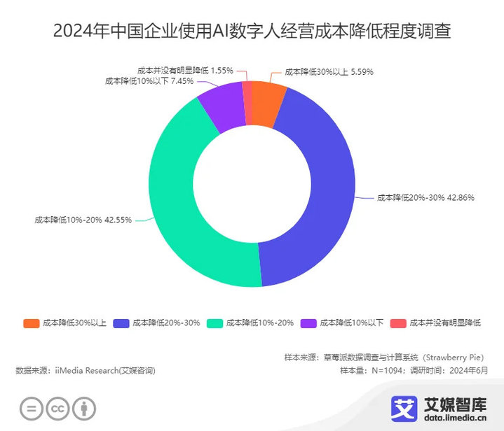艾媒咨询数据显示,42.86%的企业表示使用AI数字人后经营成本降低了20%-30%,42.55%的企业表示经营成本降低了10%-20%。