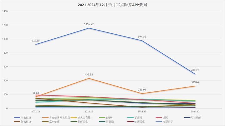 报告显示,进入2024年12月,医疗行业重点APP的日活用户规模不断增长。而在多个重点医疗行业APP中,“方舟健客网上药店”APP月活人数同比增速位列第一,活跃用户数达到319.67万人。