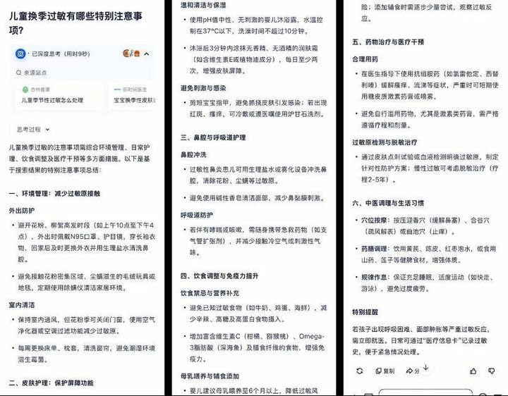 夸克的答案更为详实,将防护建议进一步细化到了皮肤护理、呼吸道护理,以及饮食调整、药物治疗、中医调理等建议,在内容的多样性方面比百度和DeepSeek R1有进步。