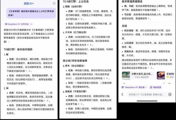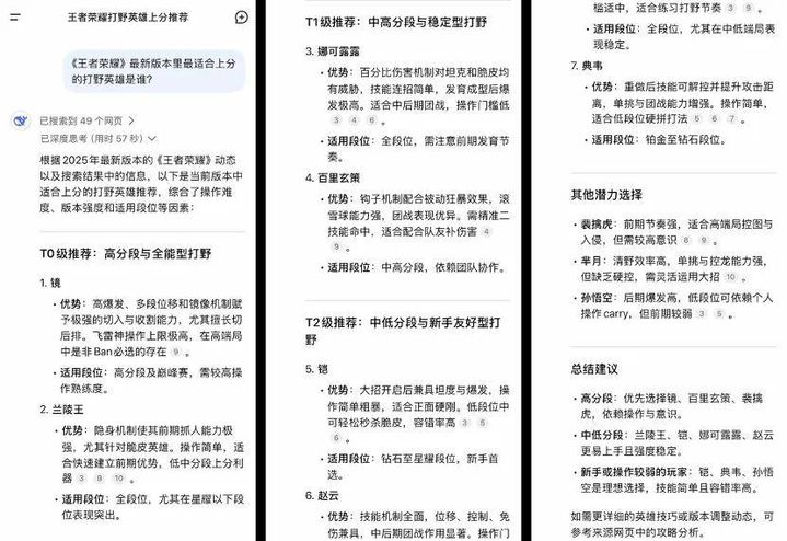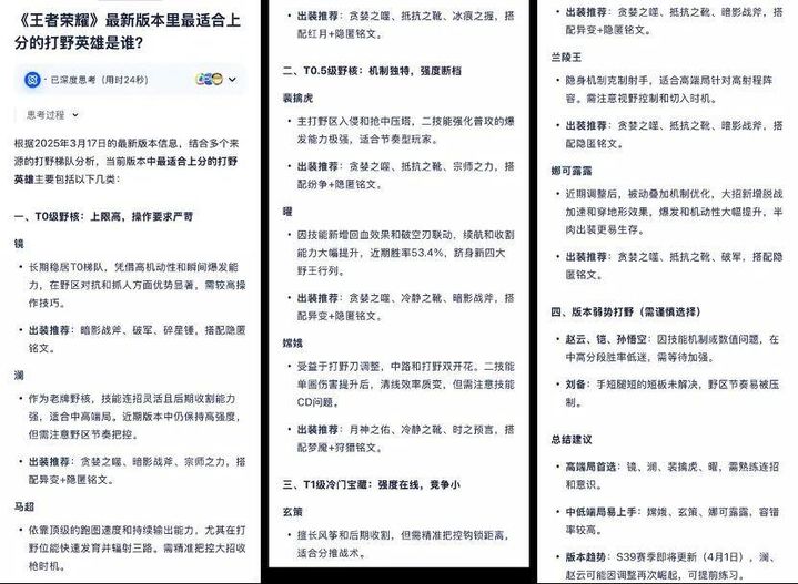 有意思的是,DeepSeek R1、百度、夸克均采用了T0、T0.5、T1的分类方法,满满的专业评测范儿,只是英雄的排序全然不同。
