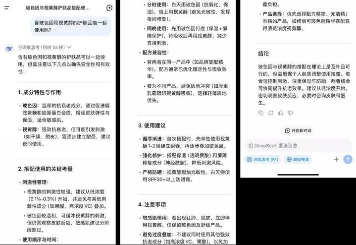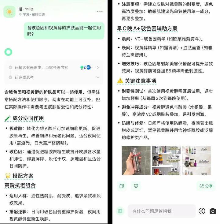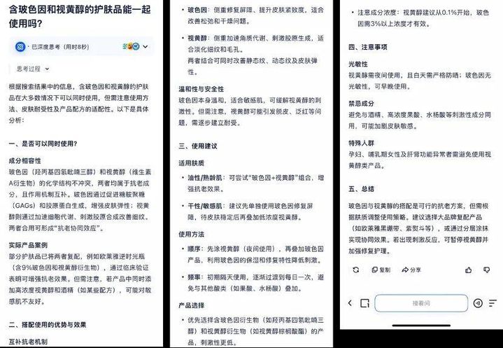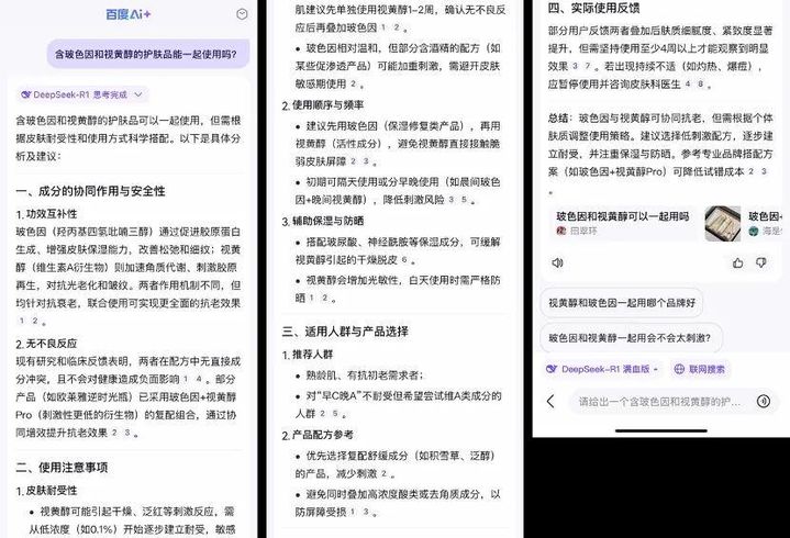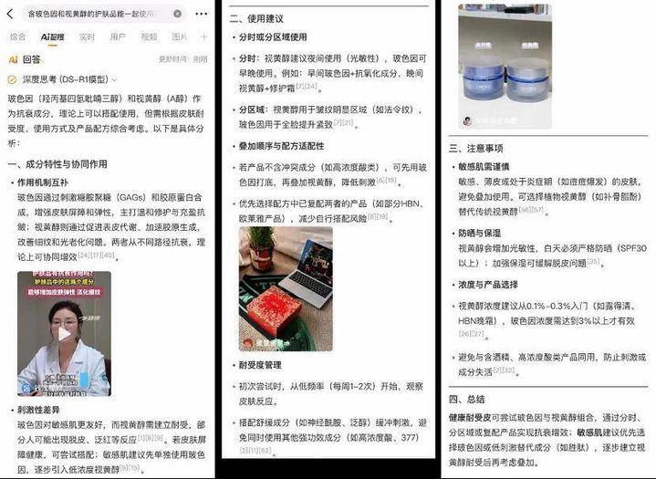 百度和夸克“终于扳回了一局”,尽管内容中出现了珀莱雅逆时光瓶、珀莱雅黑绷带等扎眼的产品名,整体上依然比较客观,自动过滤到了一些“软植入”,且成分介绍、注意事项、使用建议等都相对准确。