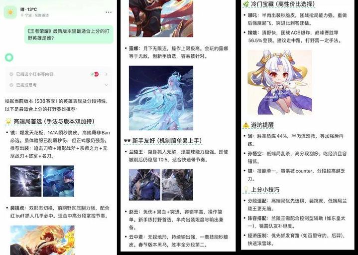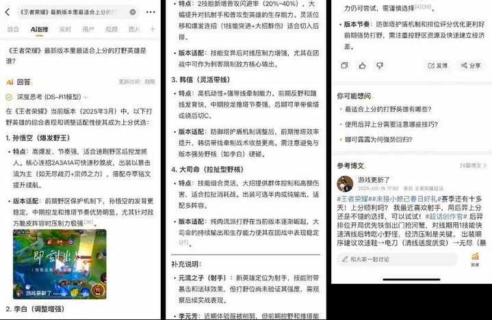 微博智搜和“点点”主要参考的是2024年12月份以后的用户内容,其中微博智搜“挖”出了二十多篇三天内的相关微博。我们认真查看了引用的每一条微博,发现微博智搜主要借鉴了多位金V博主的内容,并且在答案明确提及了英雄的特点和版本适配。