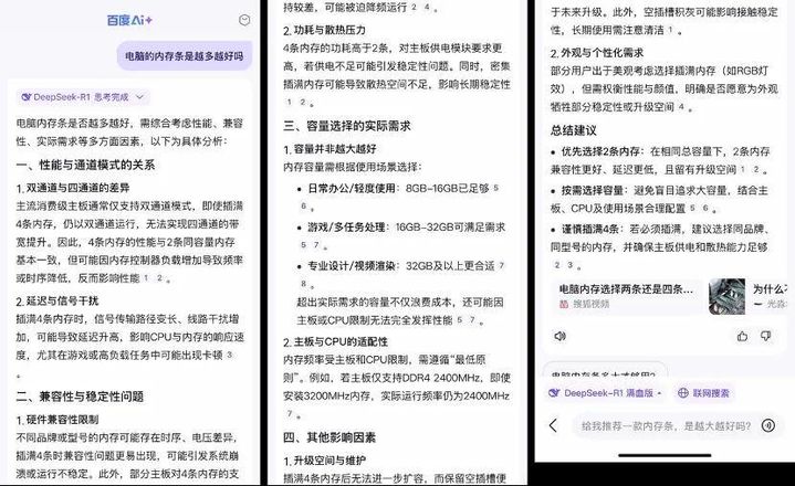 猜测症结主要在于数据源,百度和夸克的来源站点都以长篇的图文介绍为主,不少内容来自内存品牌的官网,看似是从专业的角度切入,却没有顾及到“小白”群体的认知能力。