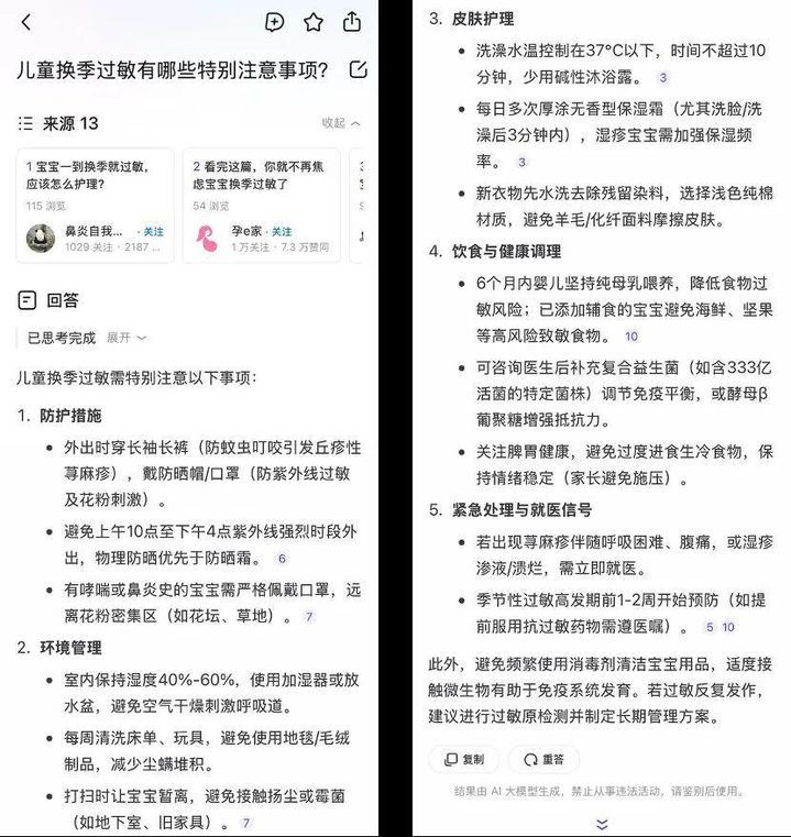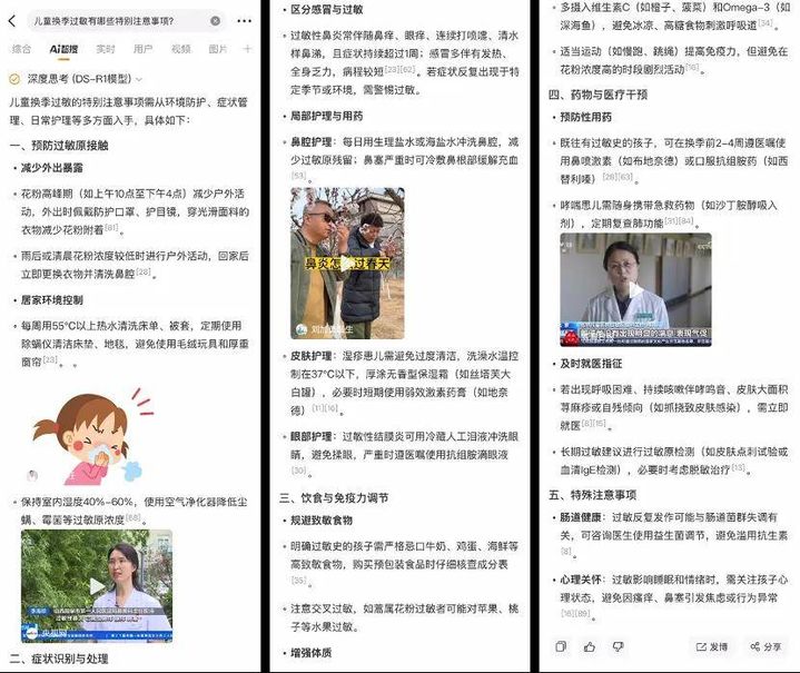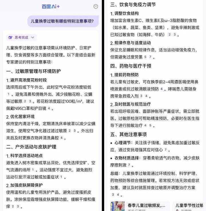 百度AI搜索的答案相对简洁了不少,聚焦在了花粉、螨虫等过敏源,然后梳理了对应的应对措施,和DeepSeek R1不相上下。