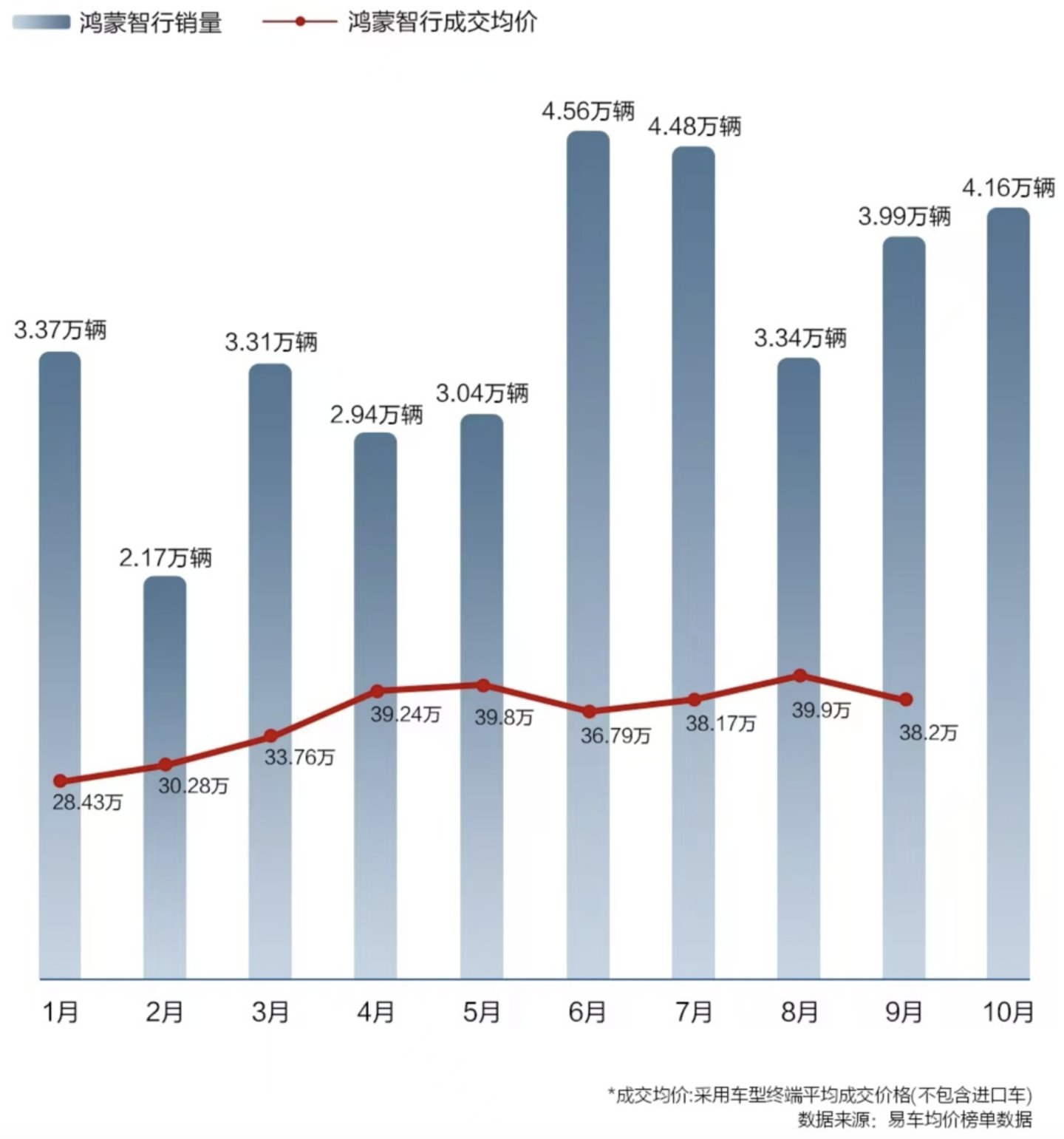 鸿蒙智行在10月交付新车41643辆。官方表示,鸿蒙智行已连续6个月蝉联高端市场成交均价TOP1。