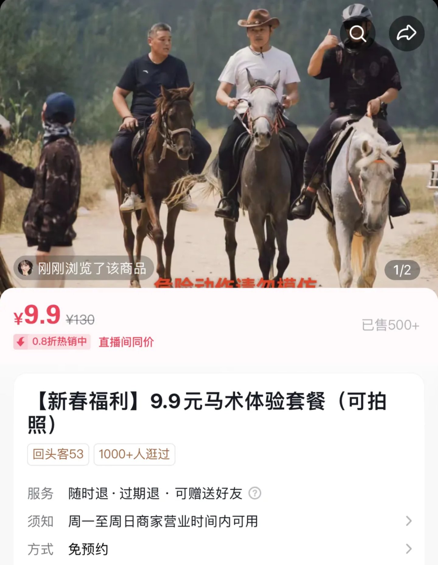 但过往的9.9,一般都只局限于餐饮界,毕竟这行成本低,吃的就是一个口碑和回头率。所以刷到抖音上的“马术9.9体验课”时,她犹豫了,因为下一栏明明白白写着第二节费用为799。但本着下班无聊去哪都是去的精神,她还是下单了体验课,第二天就冲到马术俱乐部上课。