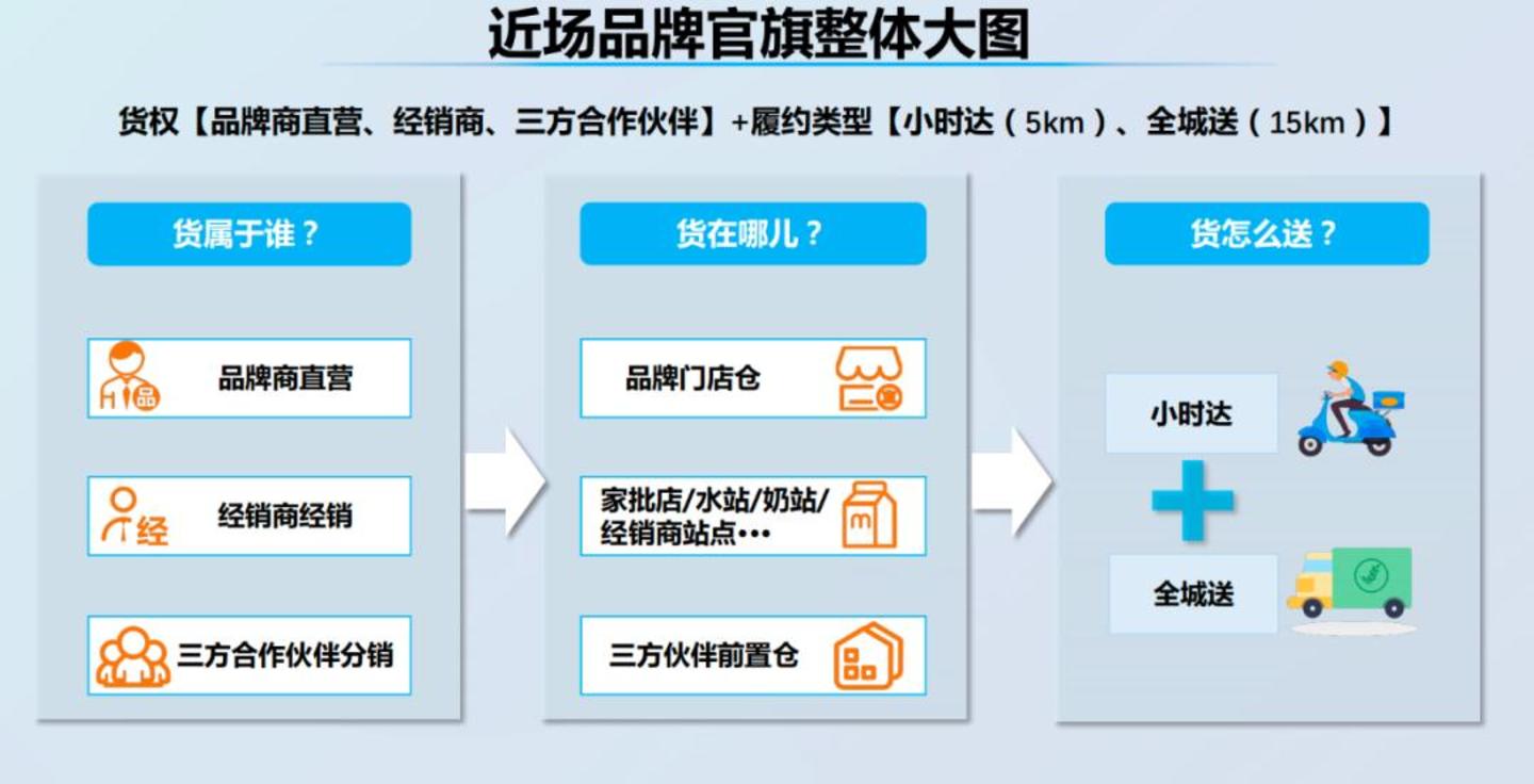 饿了么并非不做“前置仓”,但这可能不是它最主要的模式——品牌加入“近场品牌官方旗舰店”这一店型后,首先是“店仓一体”,他们也可以授权经销商通过不同的站点分销,此外还可以依托第三方合作伙伴的“前置仓”,来提供即时零售服务。