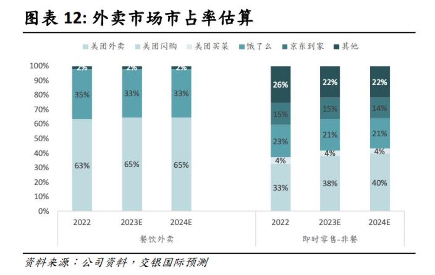 根据交银国际证券的预测来看,2024年,在即时零售-非餐市场,美团的市占率已经来到了40%,位居第二的饿了么和京东,分别拿走了21%、14%的市场份额。