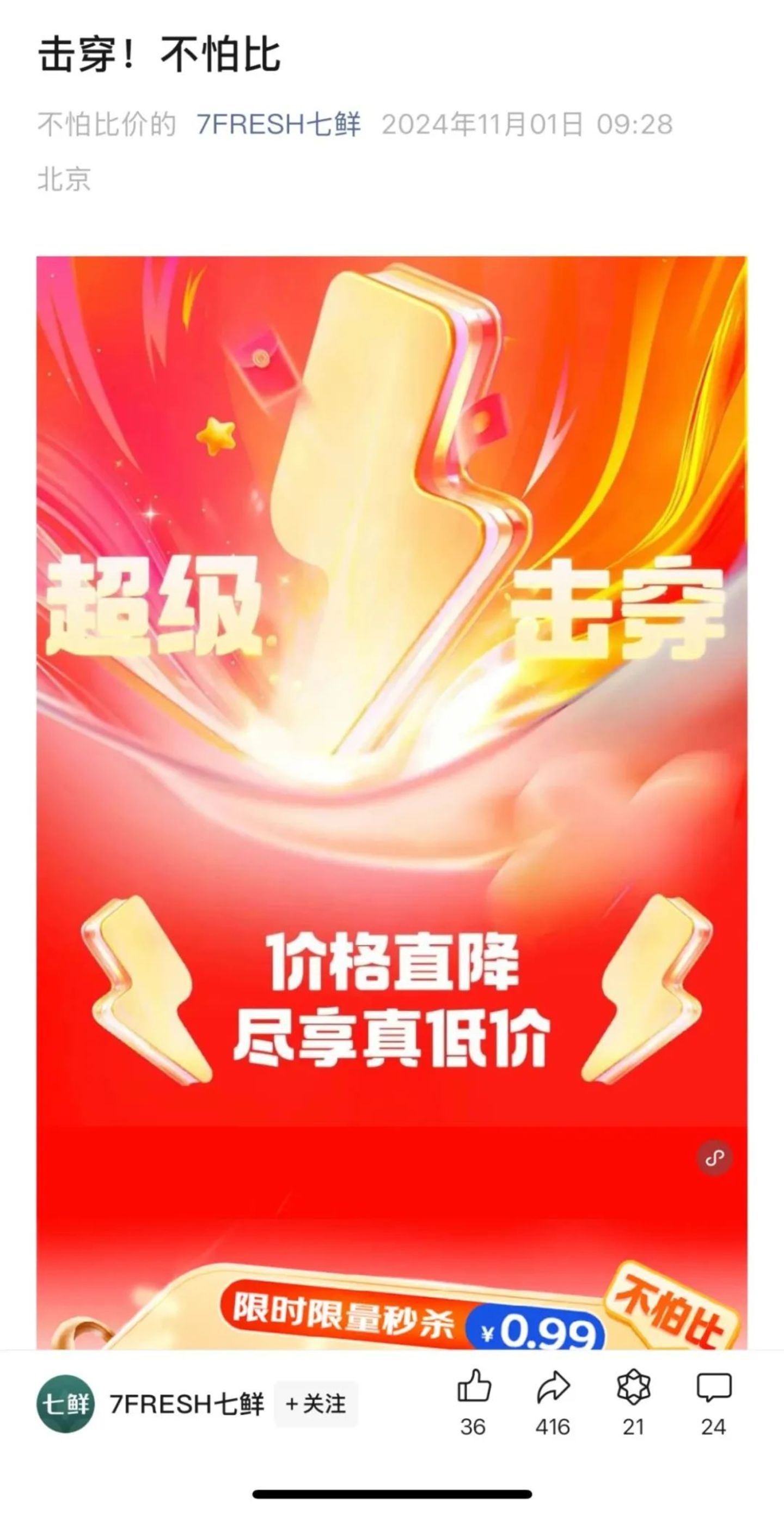 11月1日,京东七鲜超市发起了“价格战”,其上线了“击穿价真便宜不怕比”等活动,这被外界视为,京东在双十一面向阿里的盒马、美团的小象超市发起了即时零售价格战。